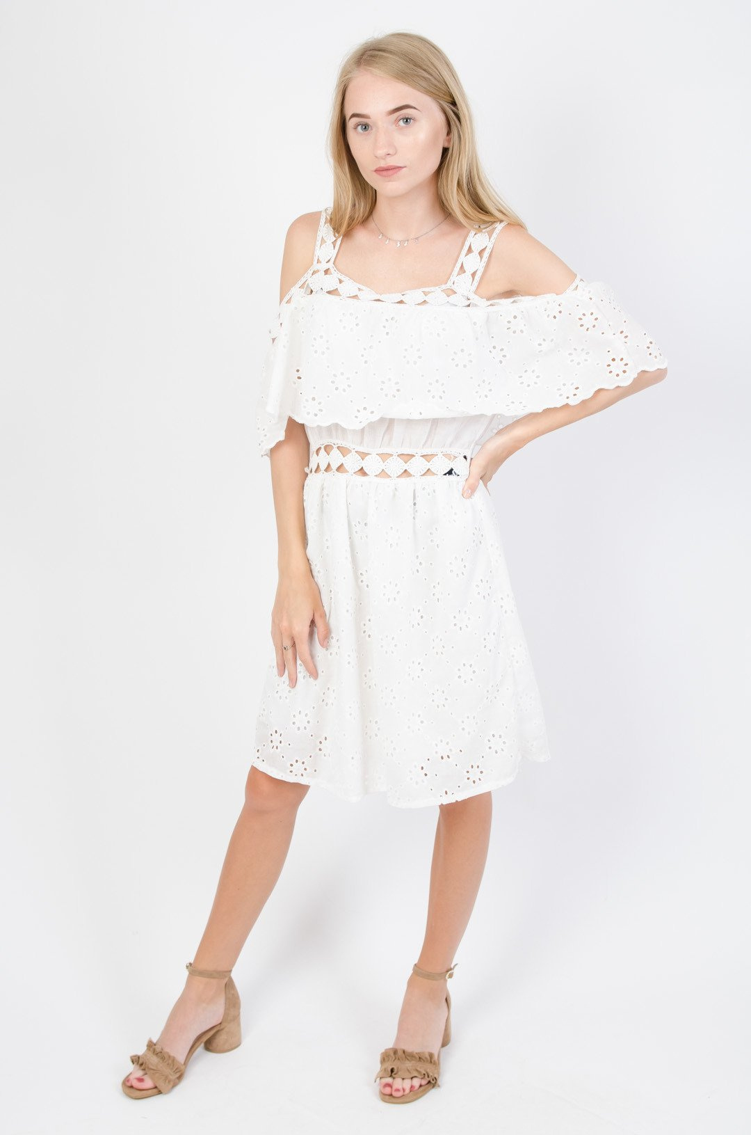 Biała ażurowa sukienka z hiszpańskim dekoltem