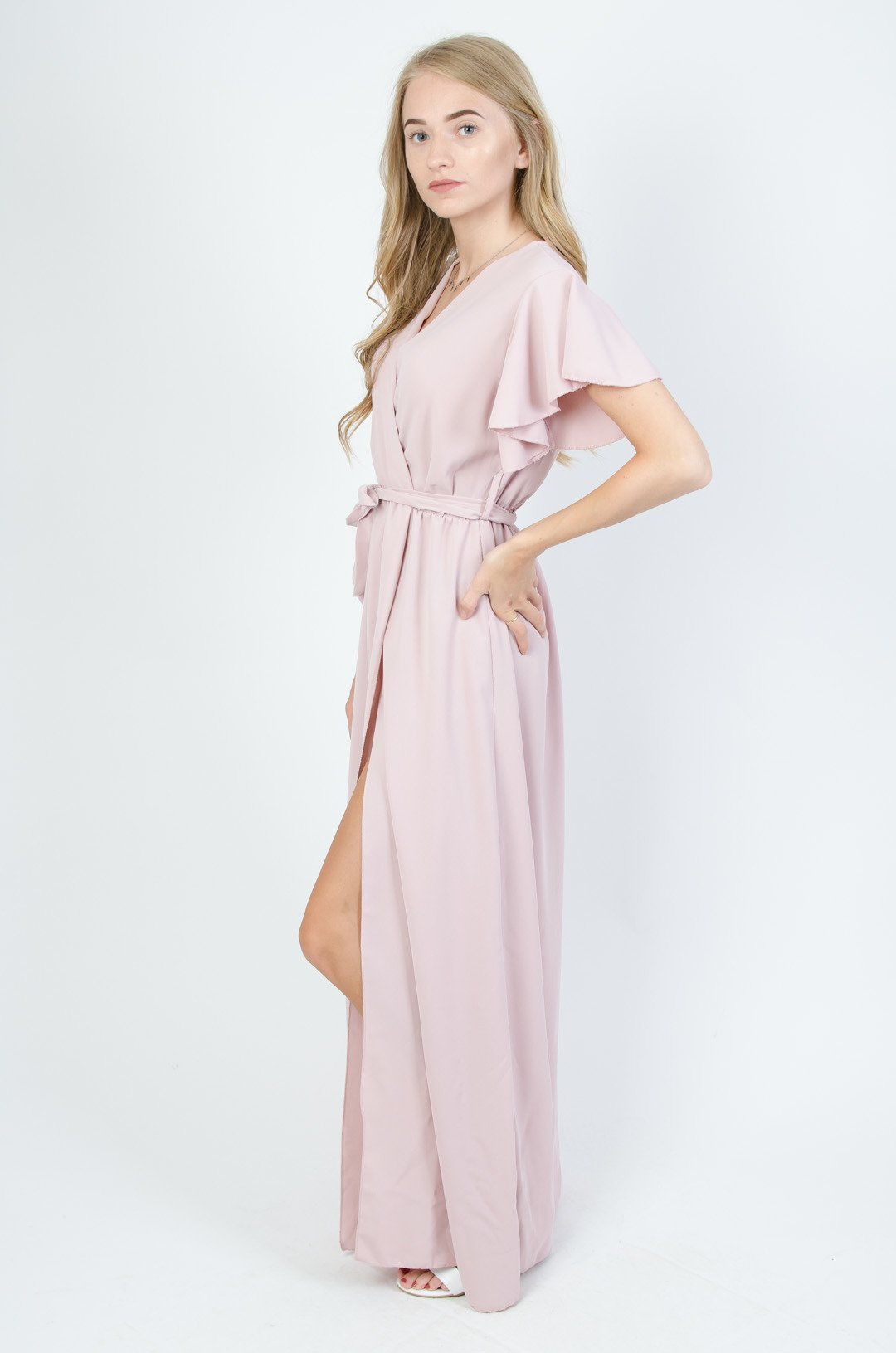 Jasno różowa długa sukienka z rozcięciem wiązana w pasie