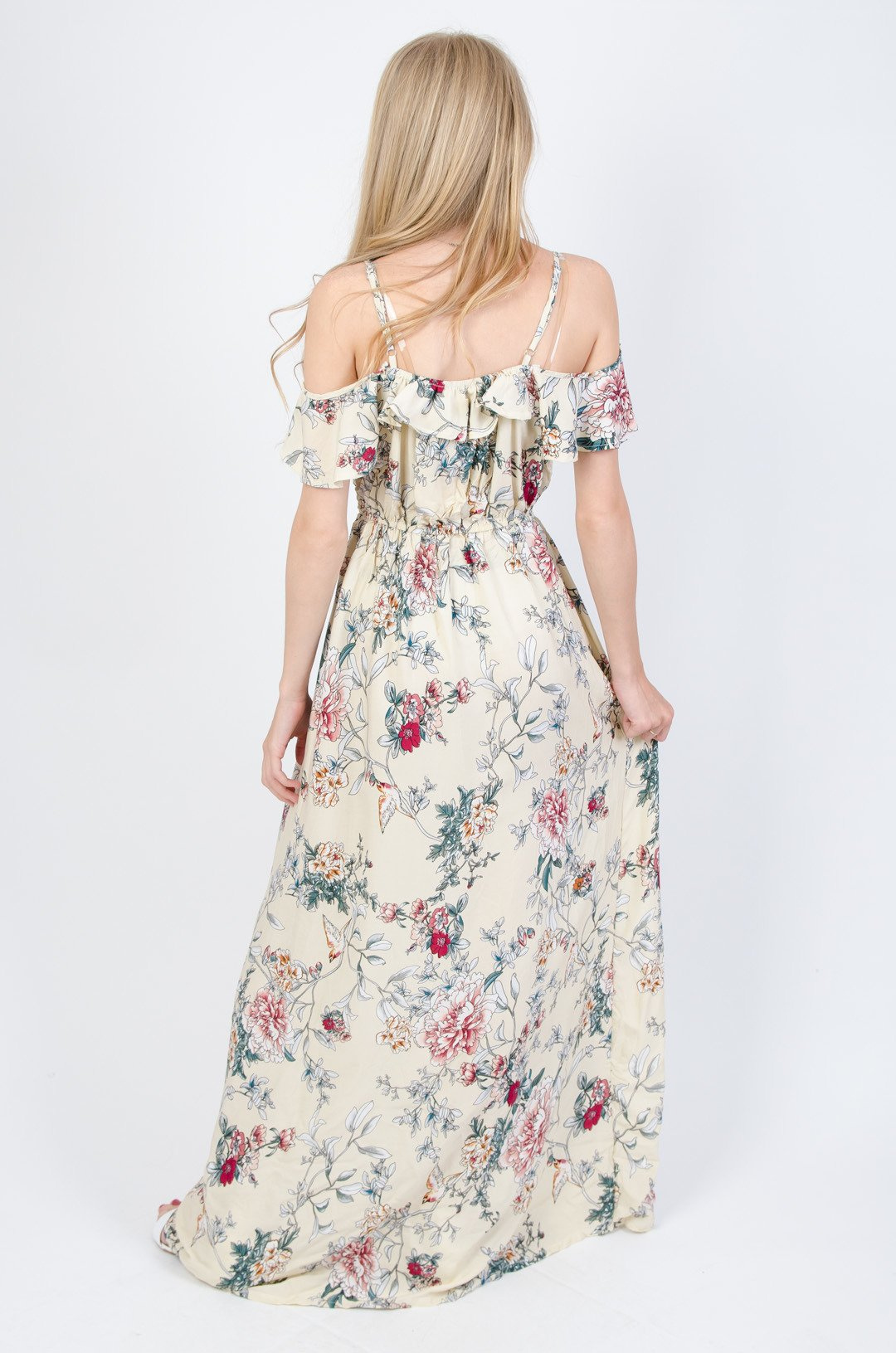 Długa kremowa sukienka w kwiaty z hiszpańskim dekoltem