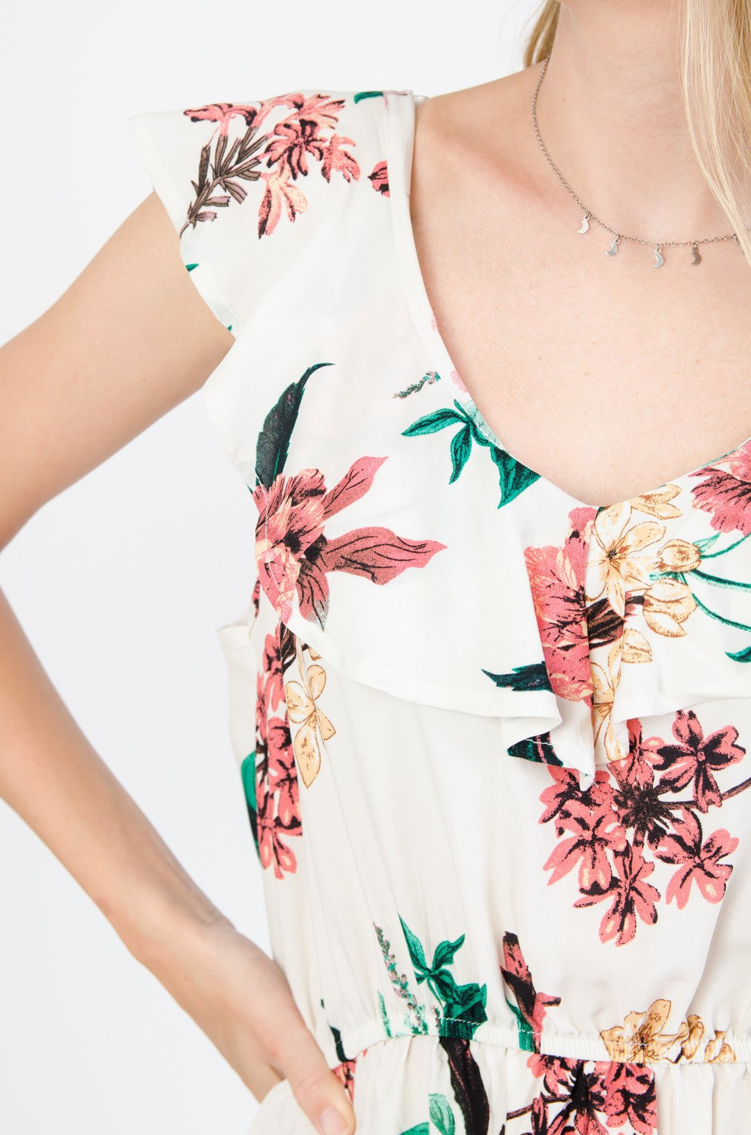 Kremowa sukienka w kwiaty z falbaną w dekolcie