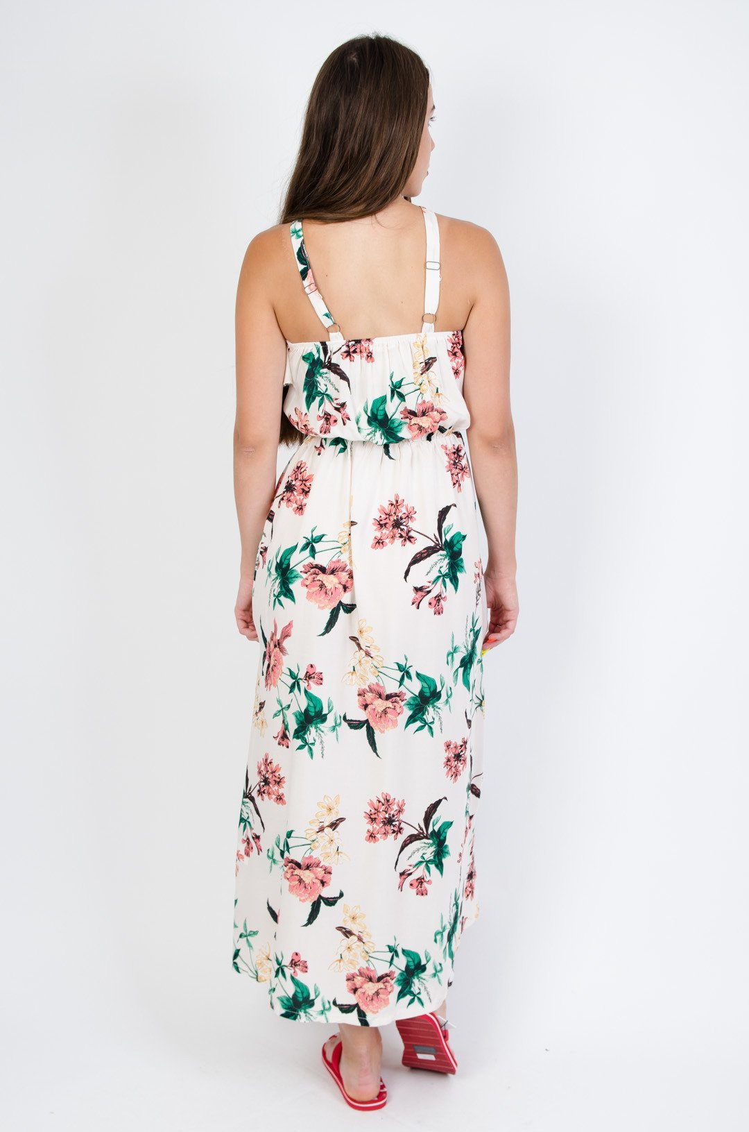 Kremowa sukienka pod szyję w kwiaty- guma w pasie