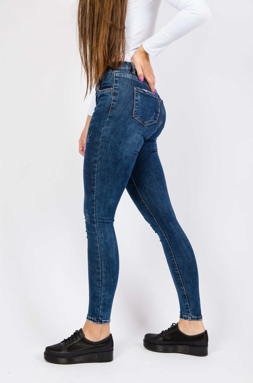 Ciemne spodnie jeansowe z przetarciami