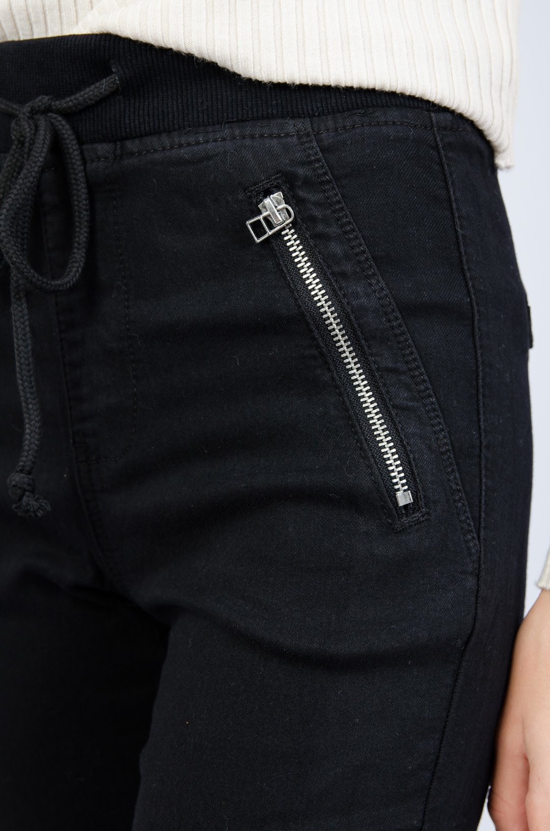 Czarne spodnie ze ściągaczem na dole oraz gumką w pasie