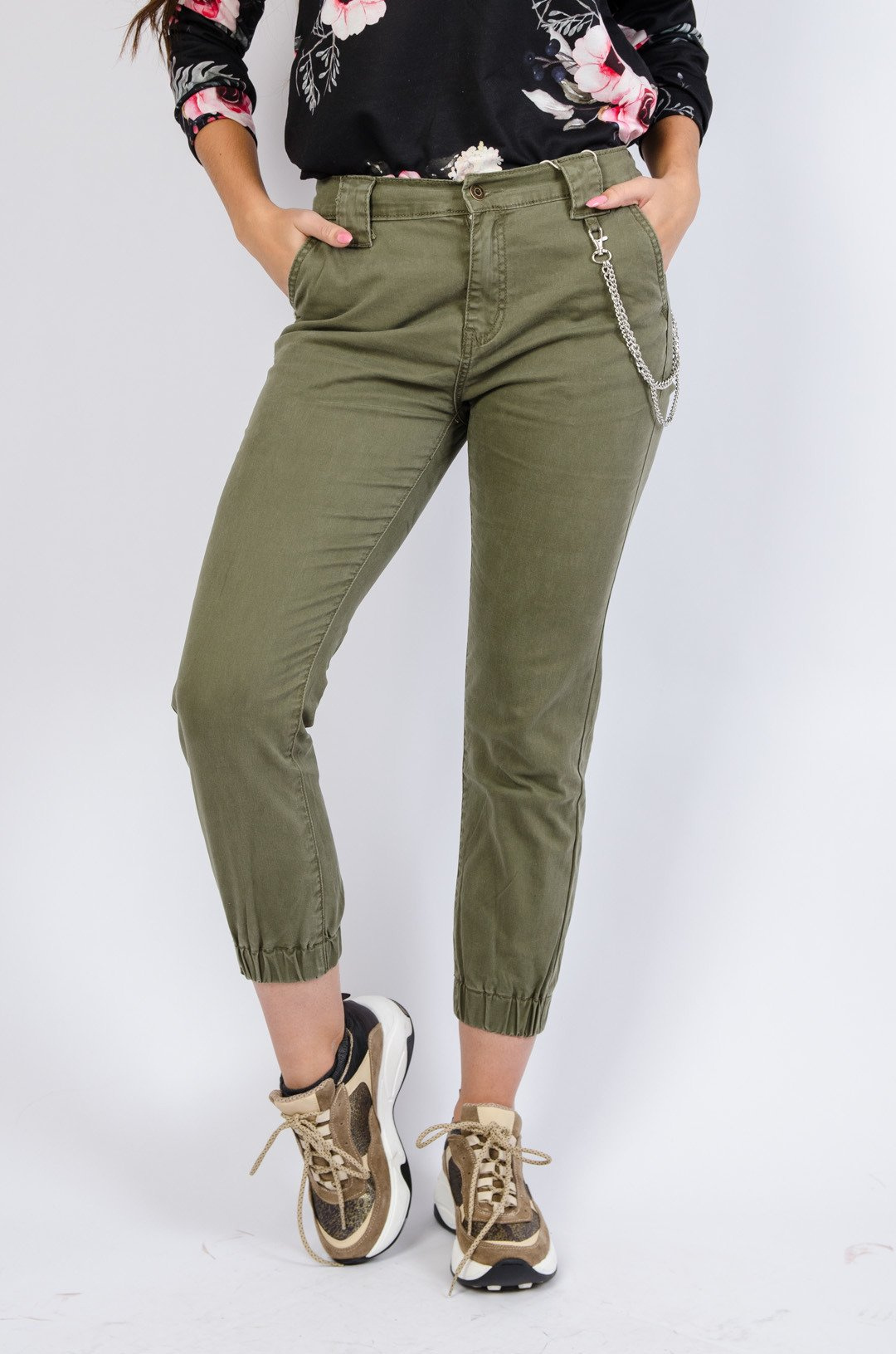 Zielone spodnie bojówki z łańcuszkiem w zestawie