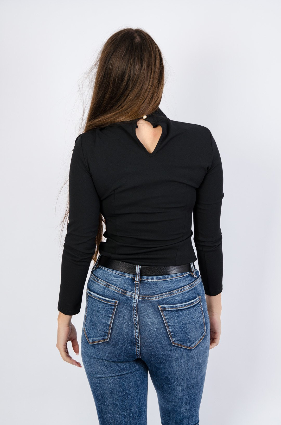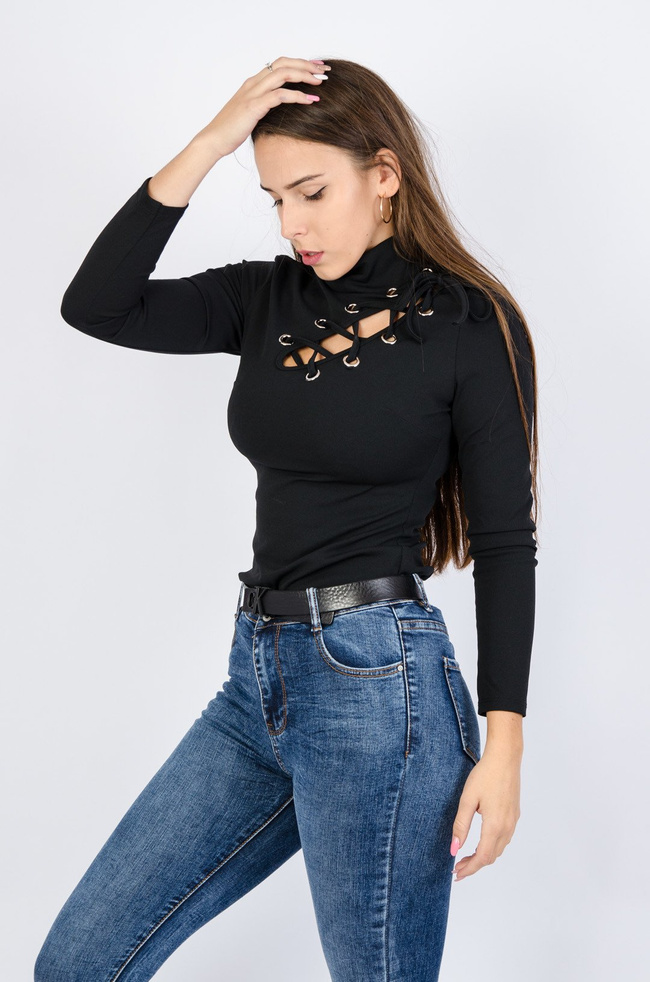 Czarna bluzka z przeplatanym sznurkiem przy dekolcie