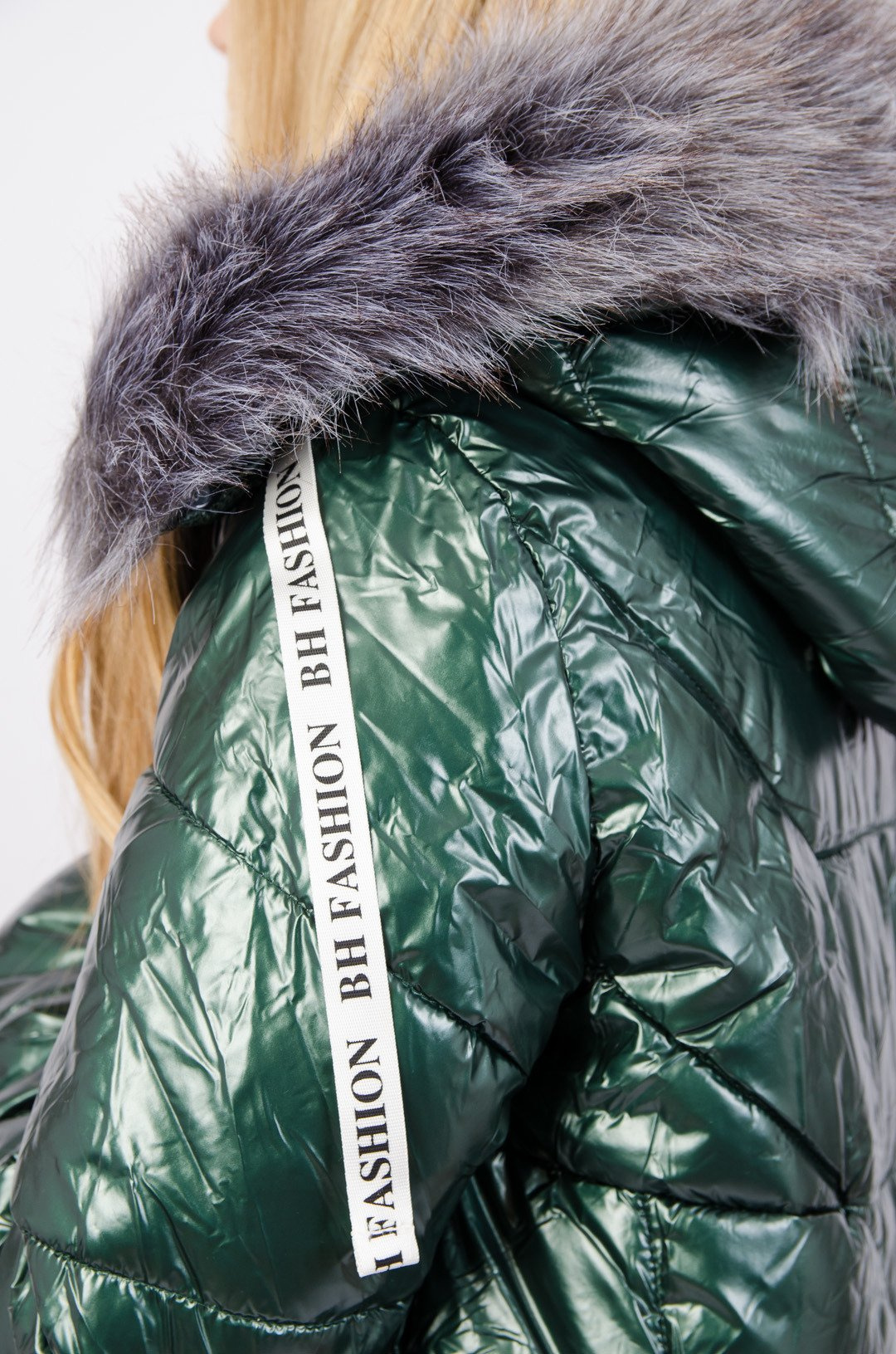 Zielona błyszcząca kurtka z futerkiem przy kapturze