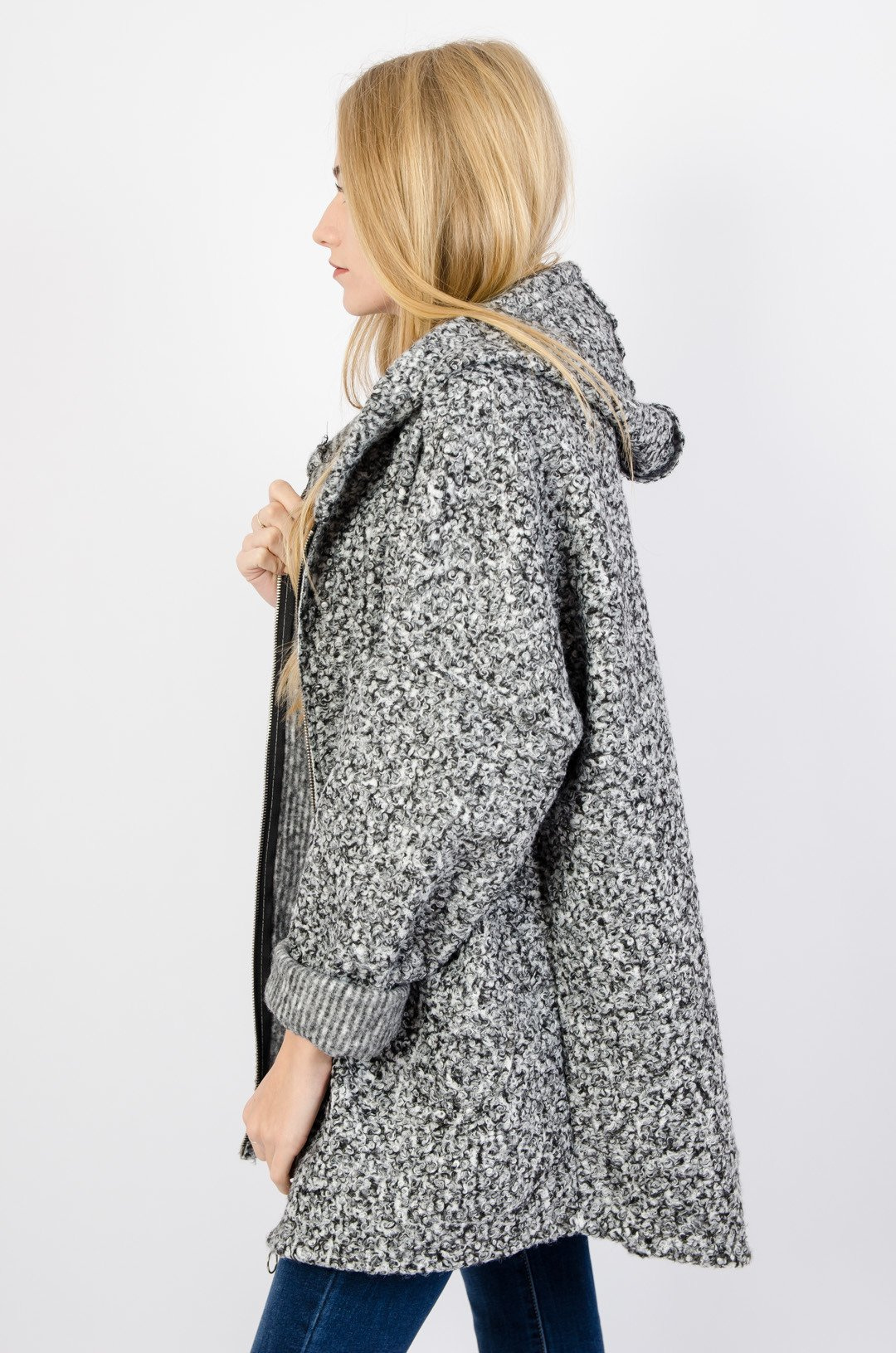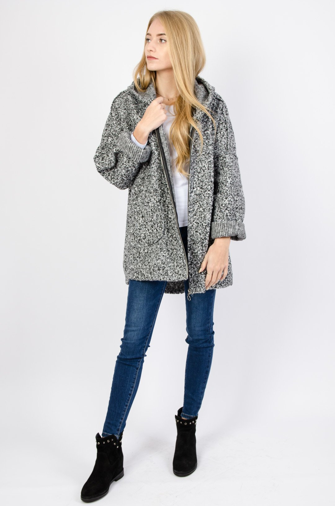 Ciemnoszary przejściowy płaszcz z asymetrycznym dołem
