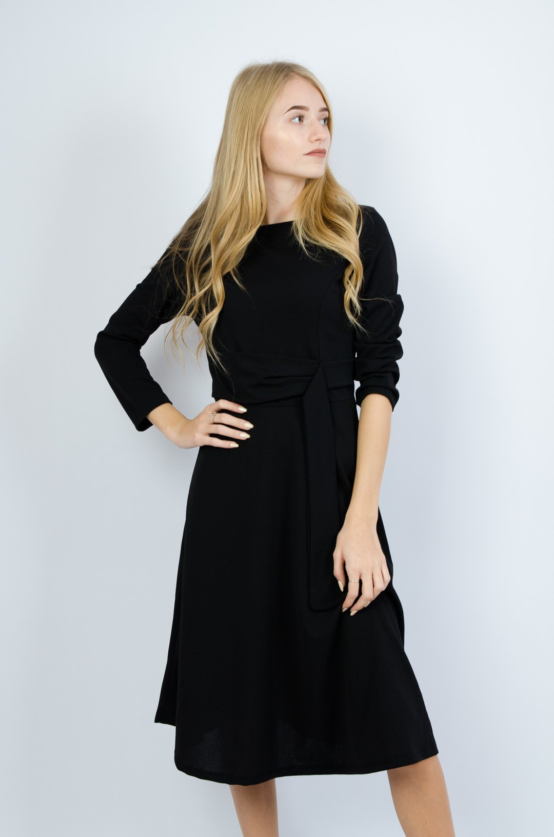 Czarna rozkloszowana sukienka przekładana w pasie