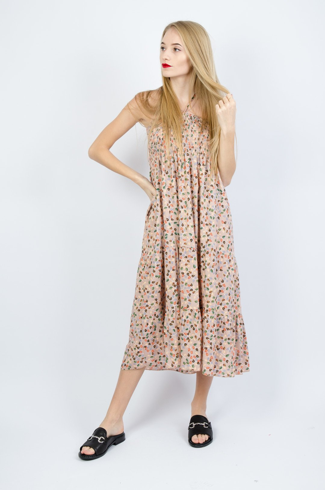 BEŻOWA  SUKIENKA BEZ RĘKAWÓW  WIĄZANA NA SZYI