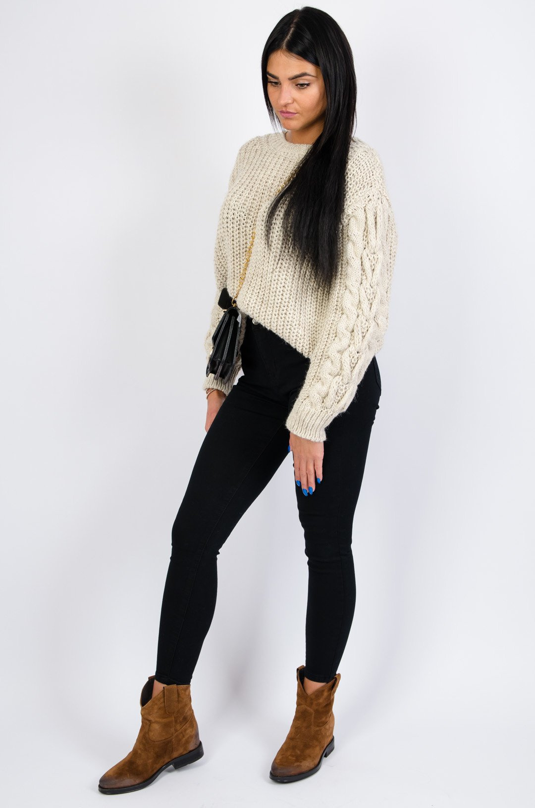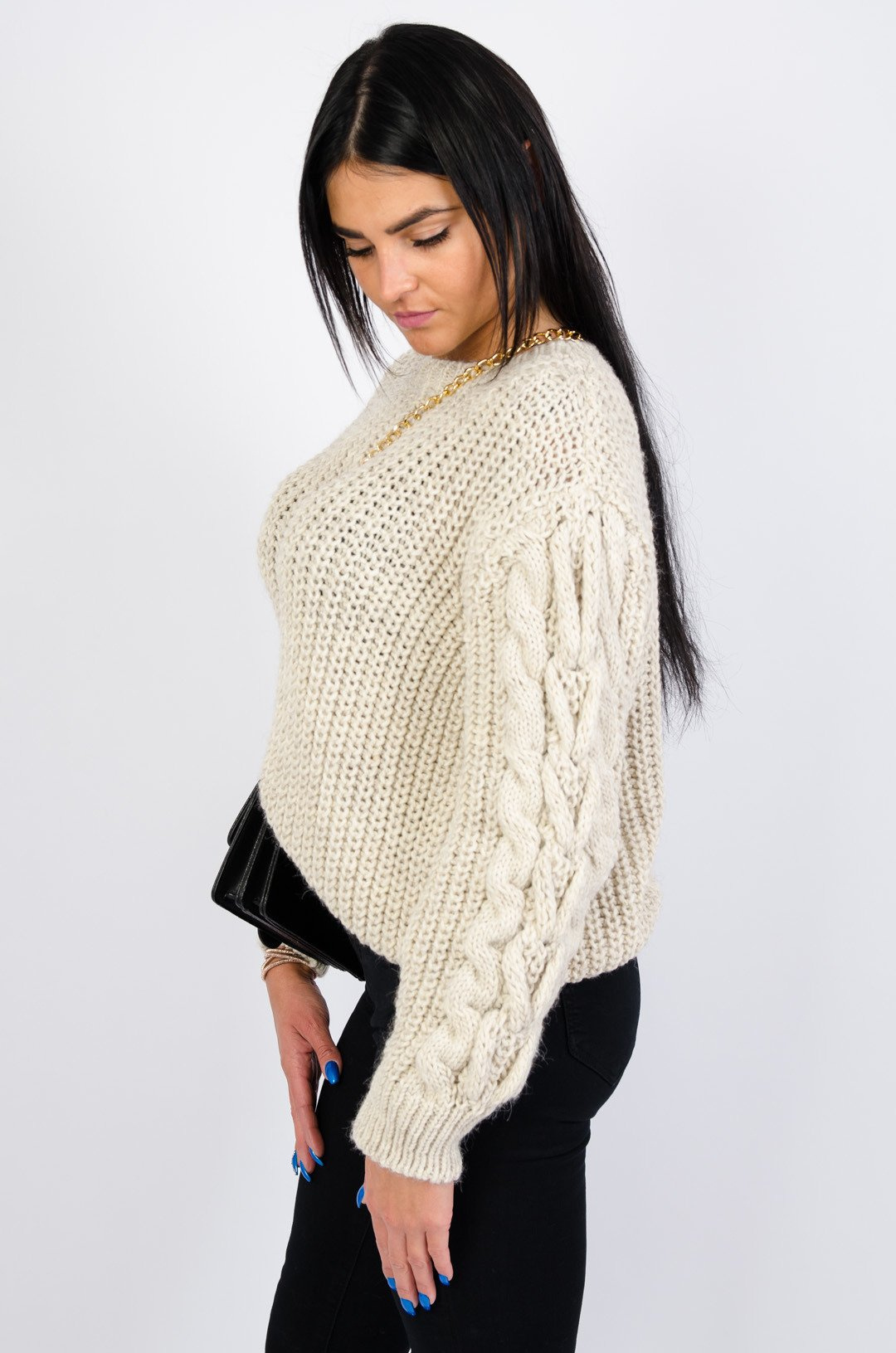 Ciepły beżowy sweter z warkoczem na rękawach