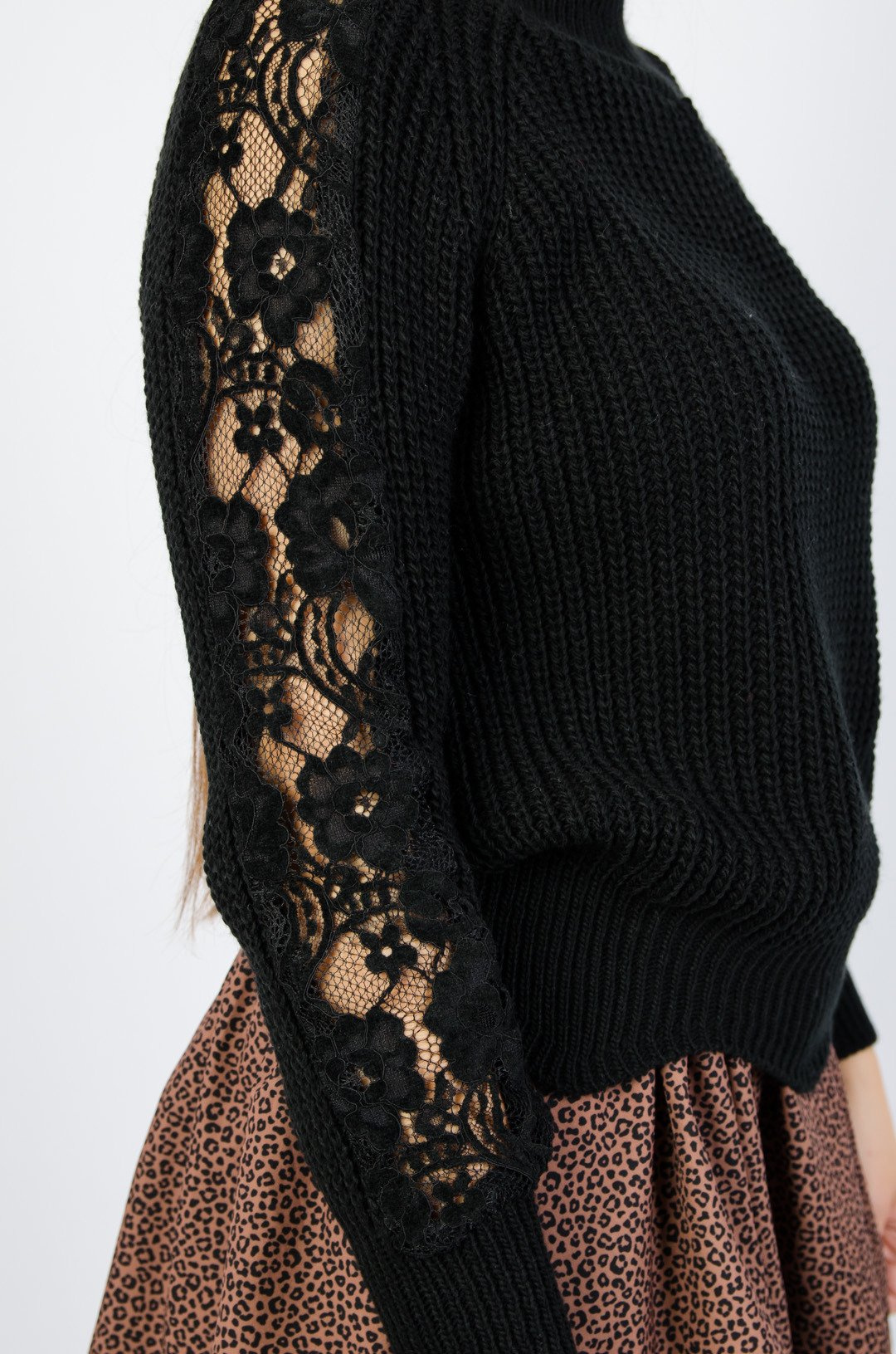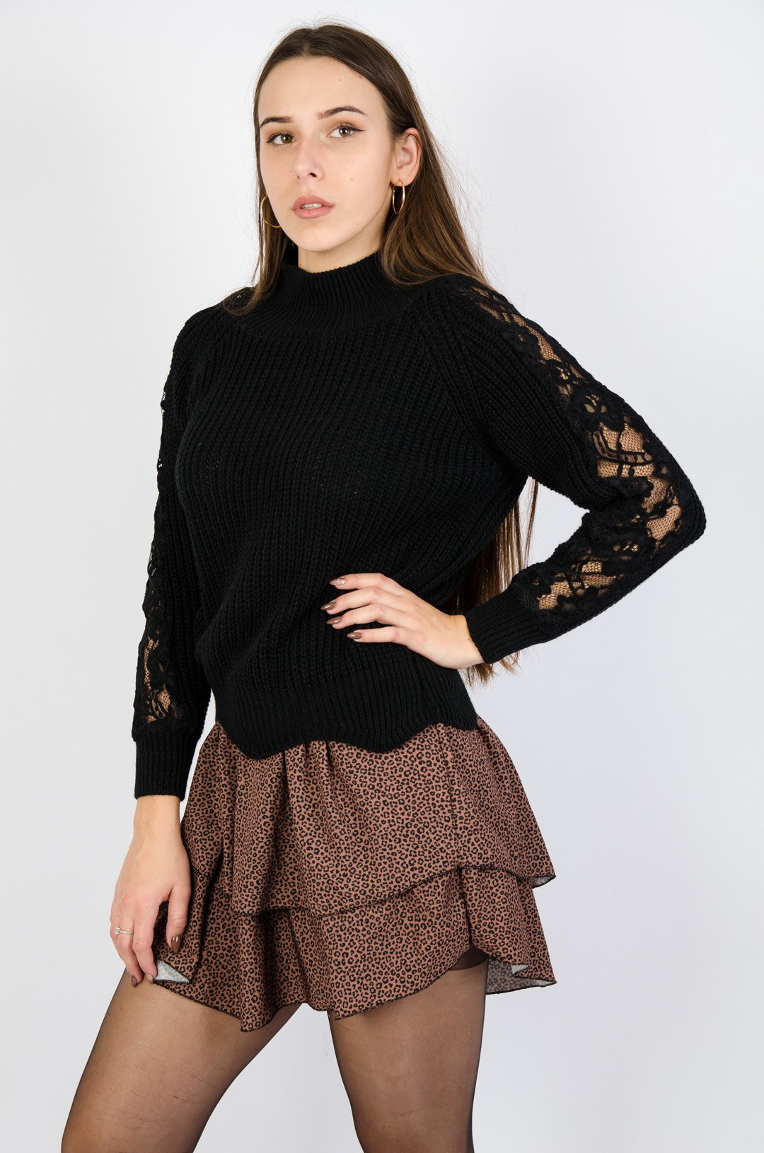 Czarny sweter z półgolfem oraz koronką na rękawach