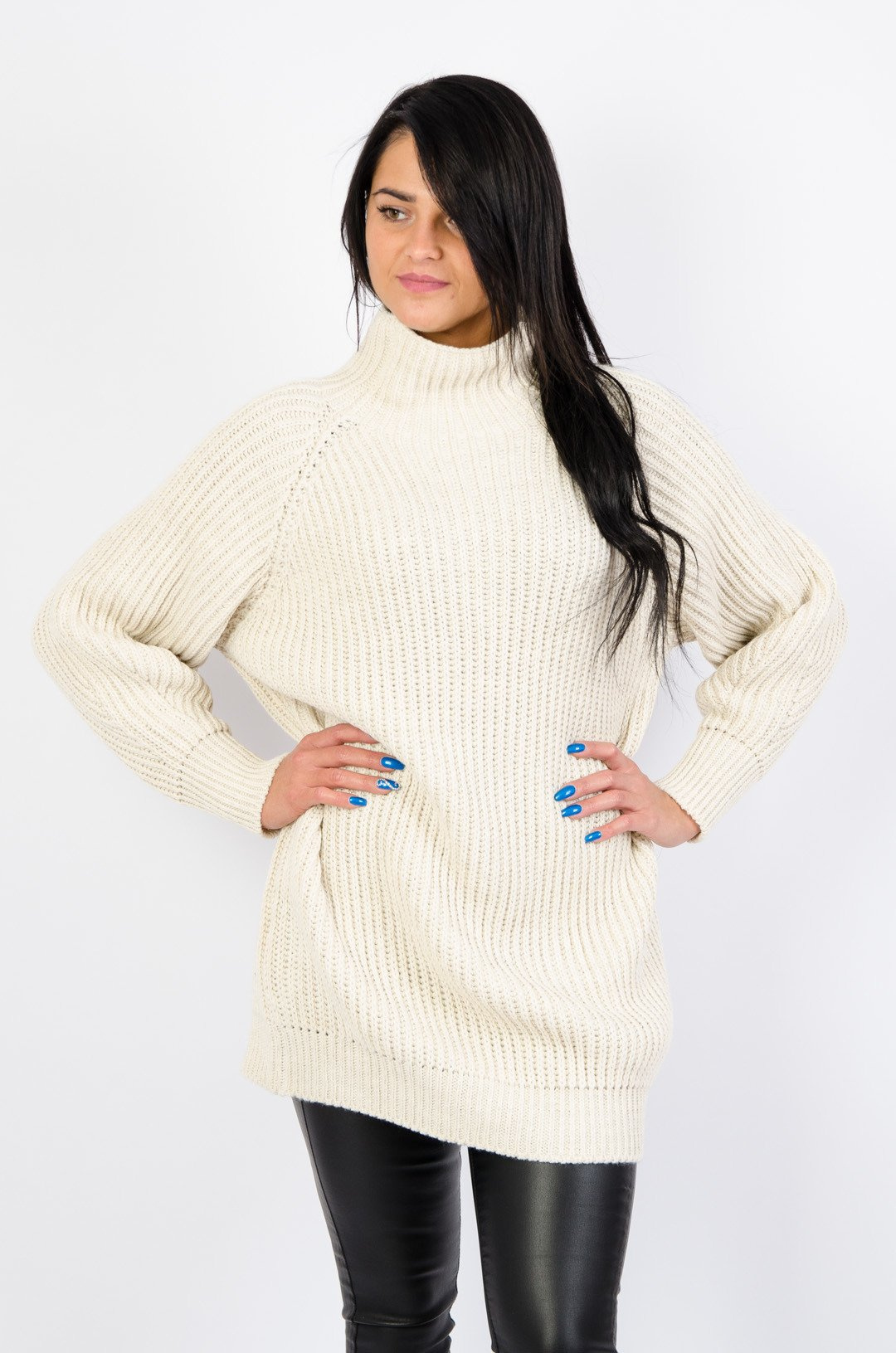BEŻOWY DŁUGI SWETER Z PÓŁGOLFEM
