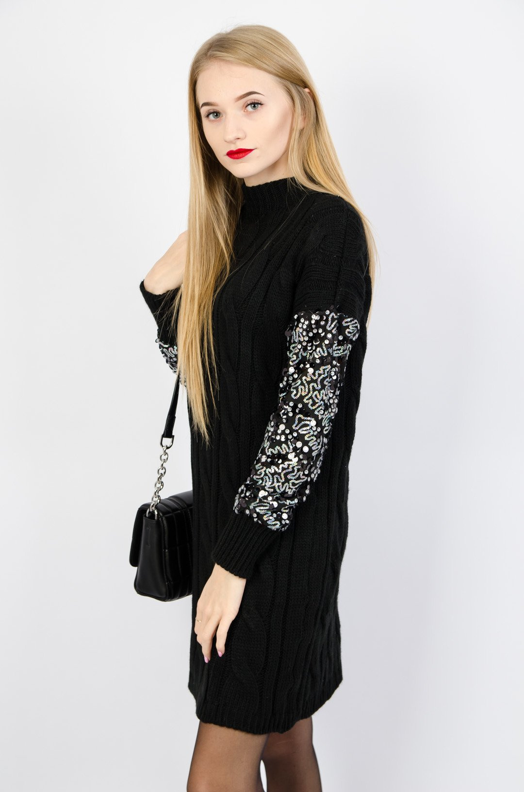 CZARNA SWETERKOWA SUKIENKA Z CEKINOWYMI RĘKAWAMI