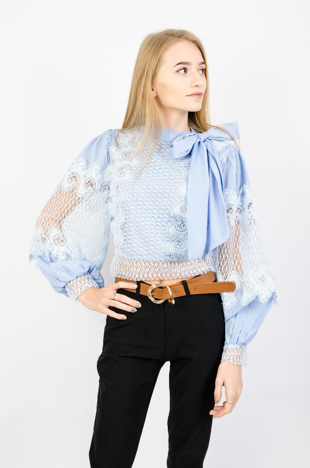 NIEBIESKA AŻUROWA BLUZKA Z BUFIASTYMI RĘKAWAMI