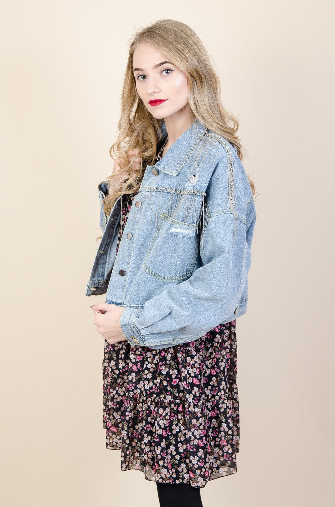 JASNA KURTKA JEANSOWA OVERSIZE Z CYRKONIAMI + FRĘDZLE