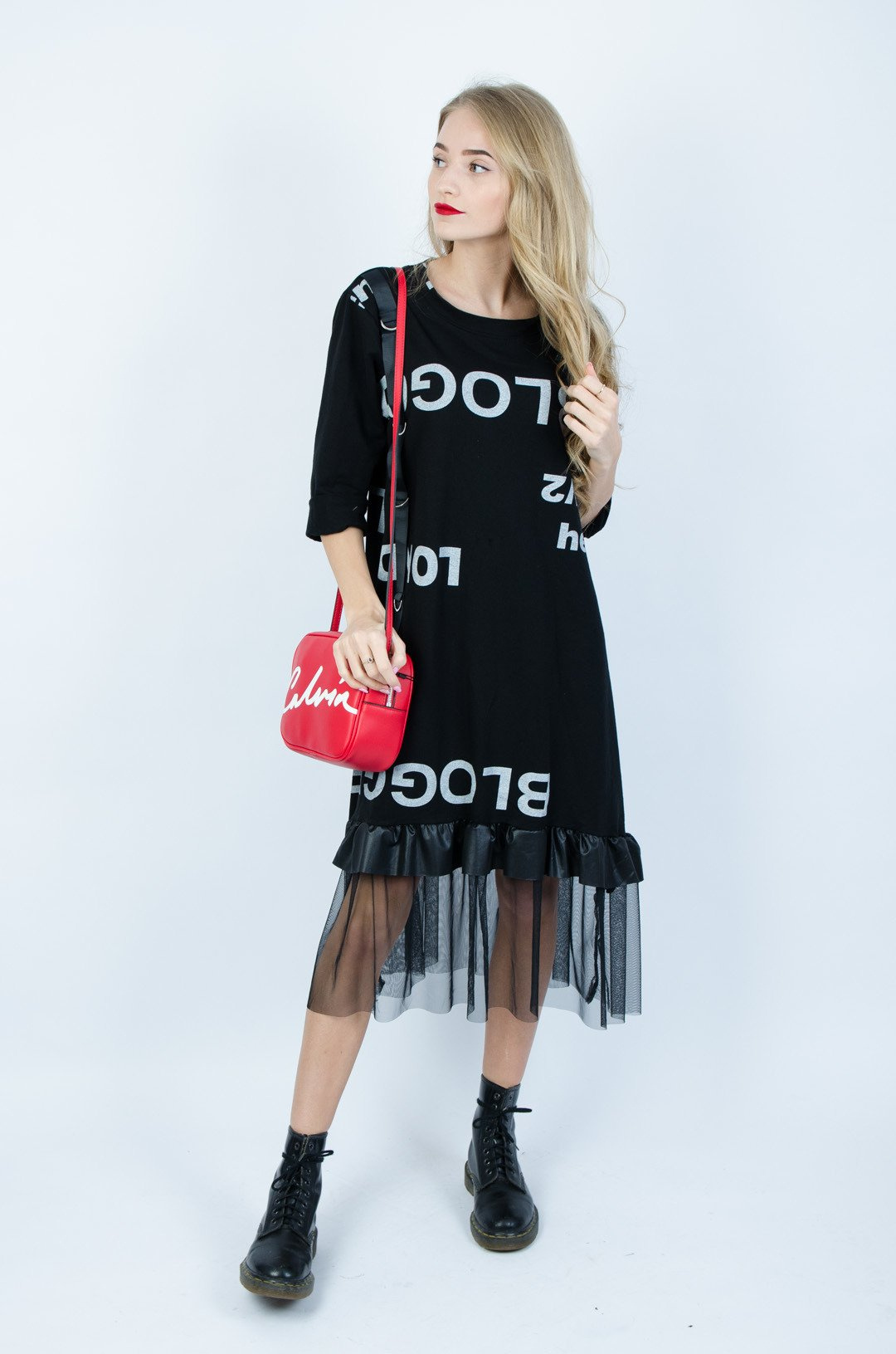 CZARNA DZIANINOWA SUKIENKA Z TIULOWYM DOŁEM