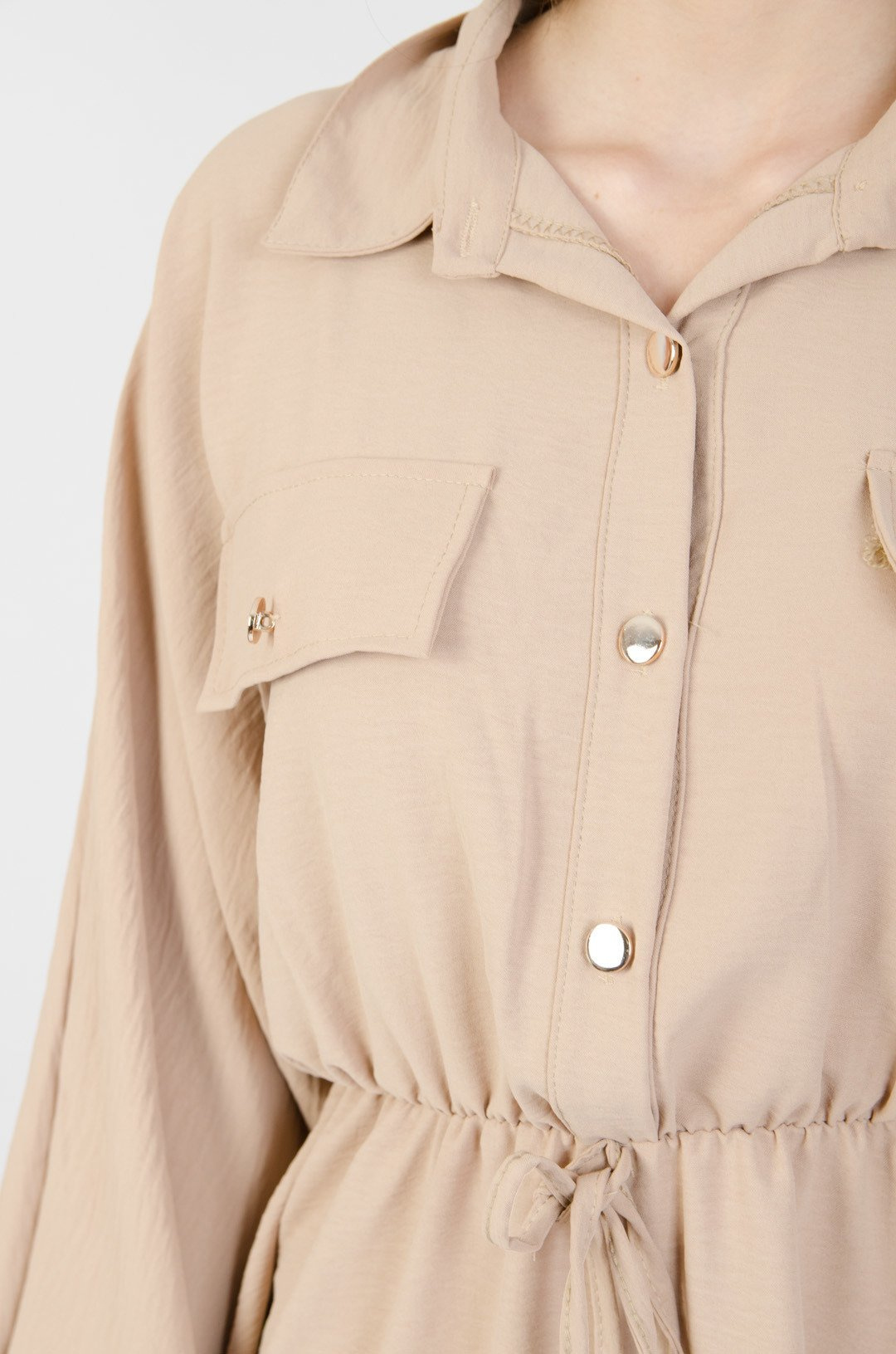 BEŻOWA SUKIENKA Z KREPY ŚCIĄGANA W PASIE
