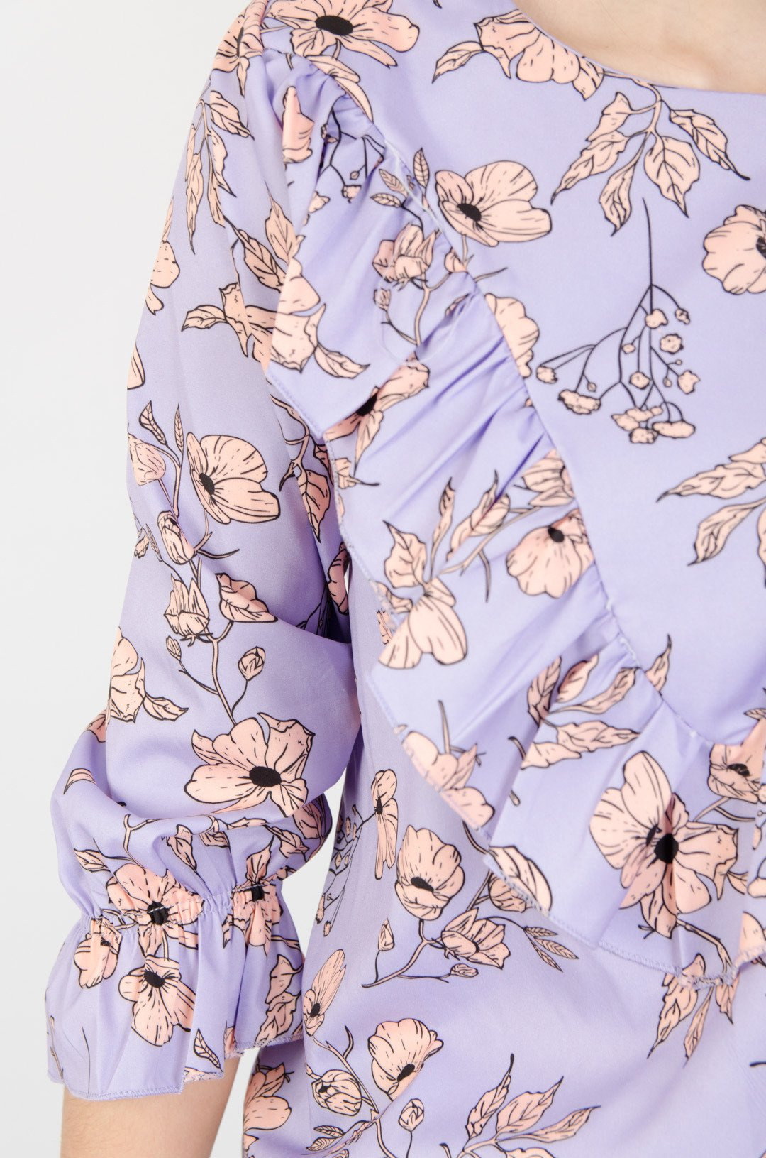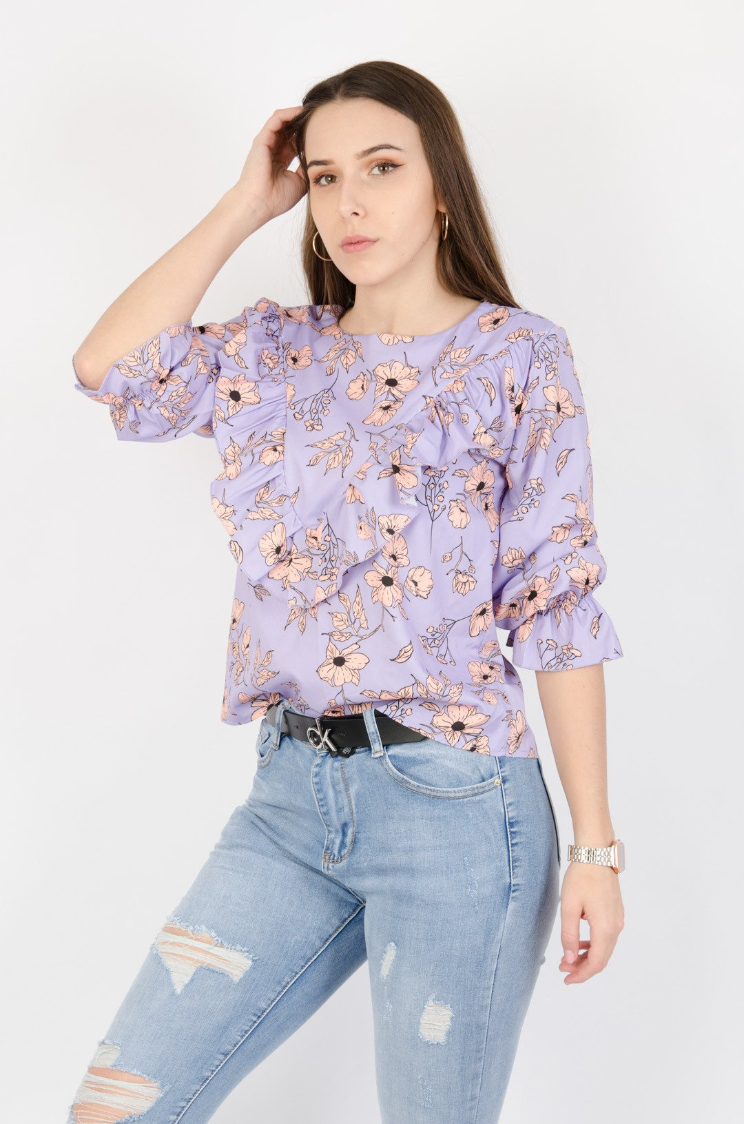 Fioletowa bluzka w pomarańczowe kwiaty z falbaną