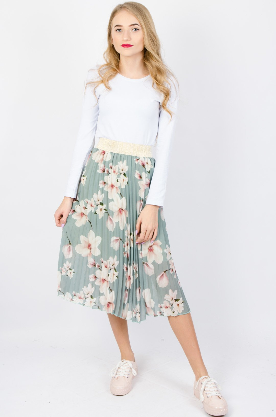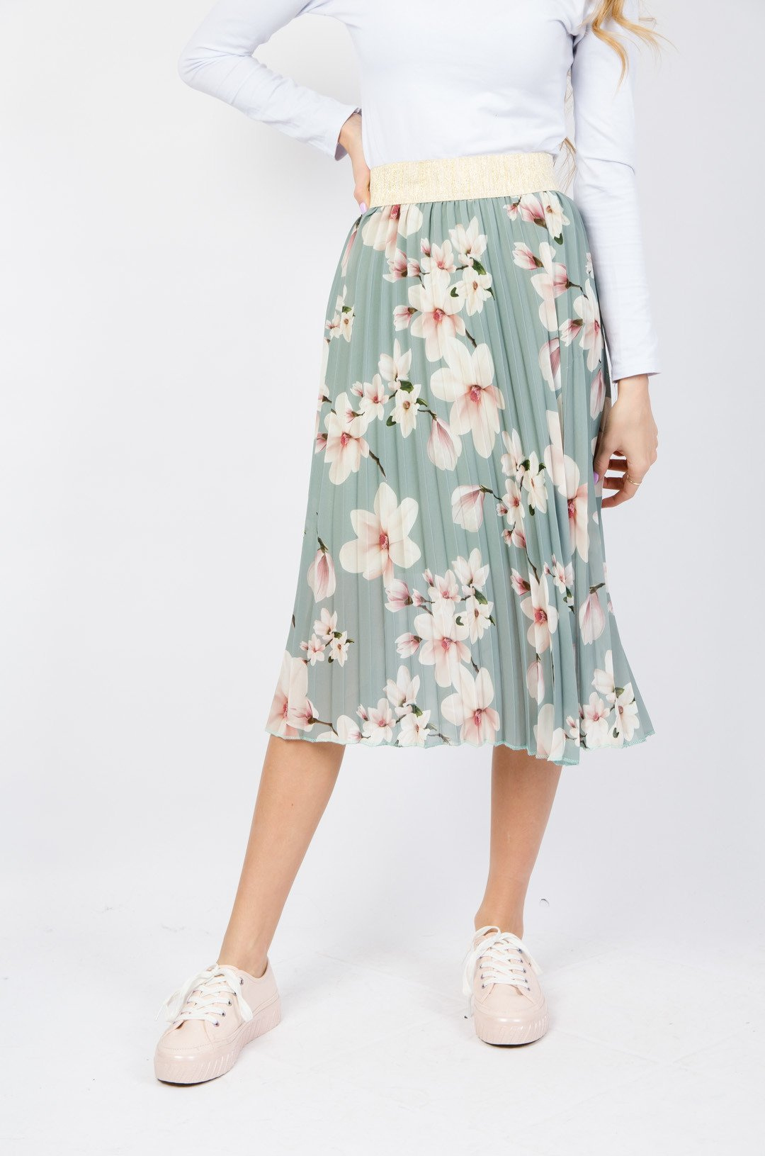 PLISOWANA SPÓDNICA W KWIATY W KOLORZE ZIELONYM