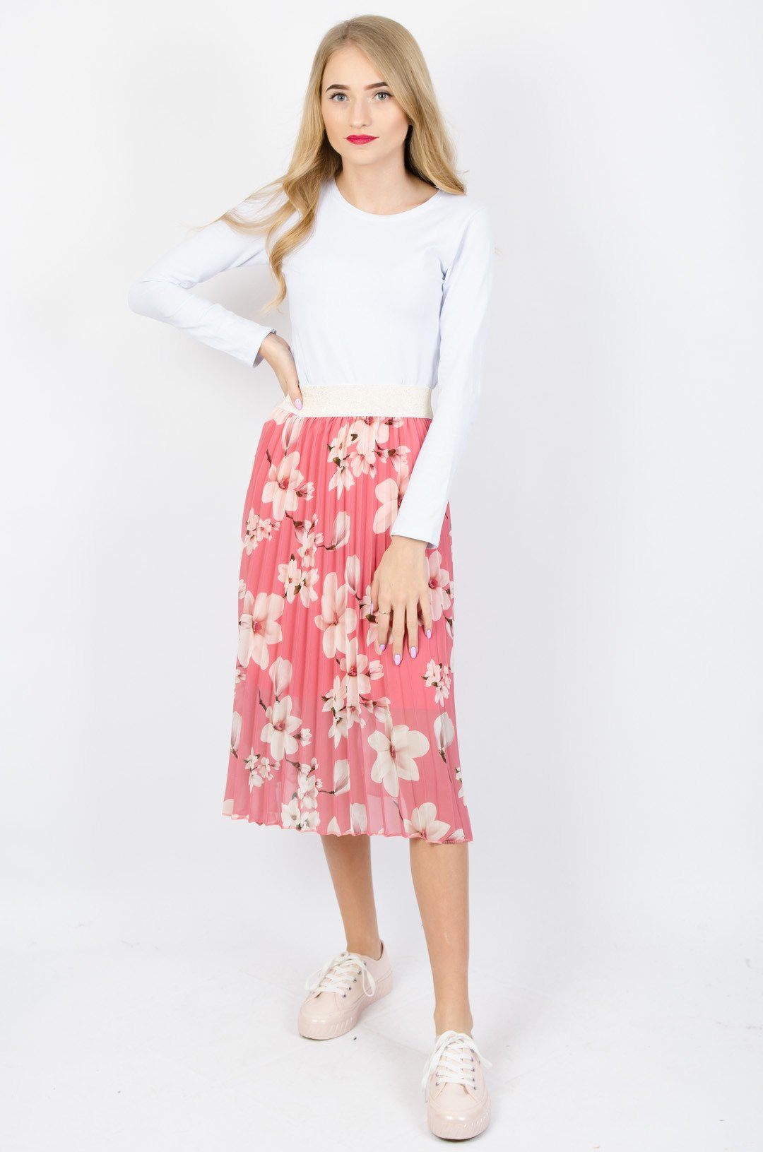 PLISOWANA SPÓDNICA W KWIATY W KOLORZE RÓŻOWYM