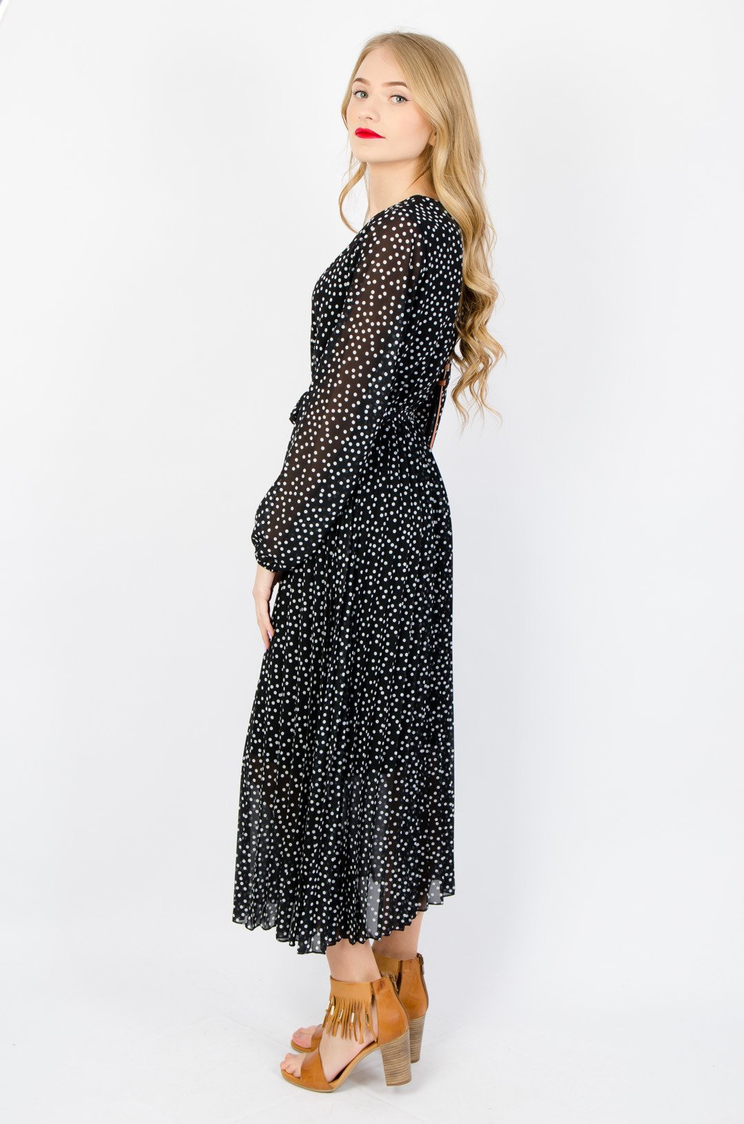 SZYFONOWA SUKIENKA W KROPKI Z PLISOWANYM DOŁEM - CZARNA