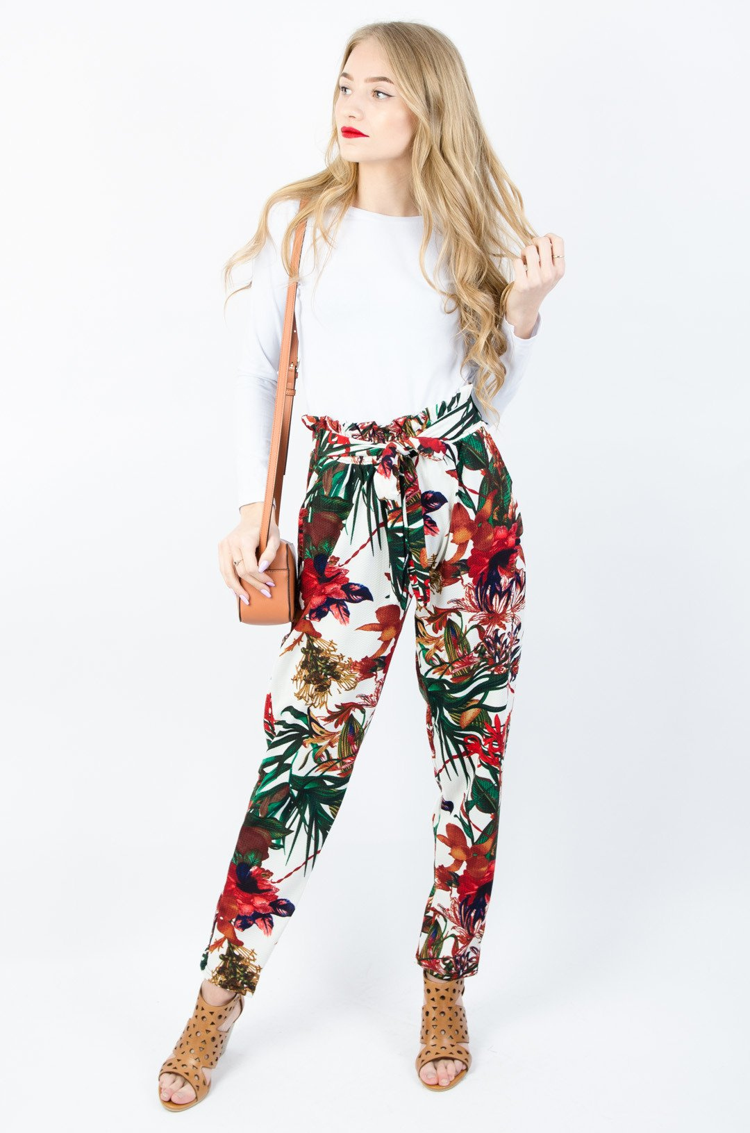 Białe alladynki w kwiaty z wiązaniem w pasie.