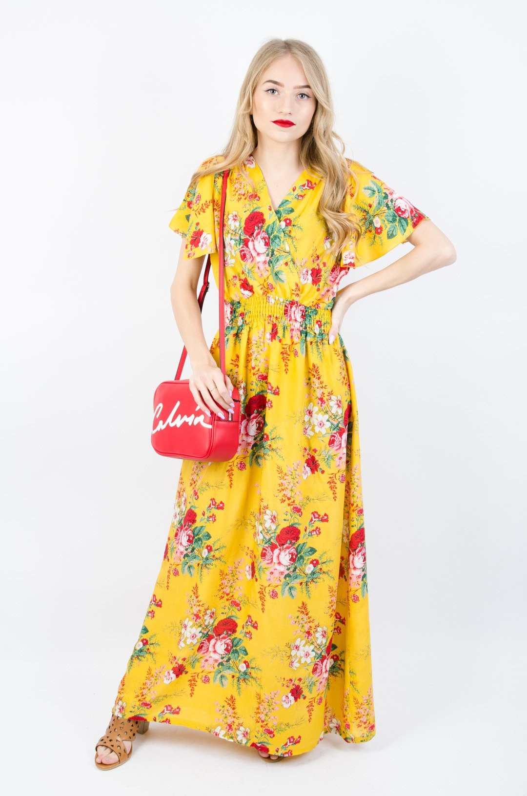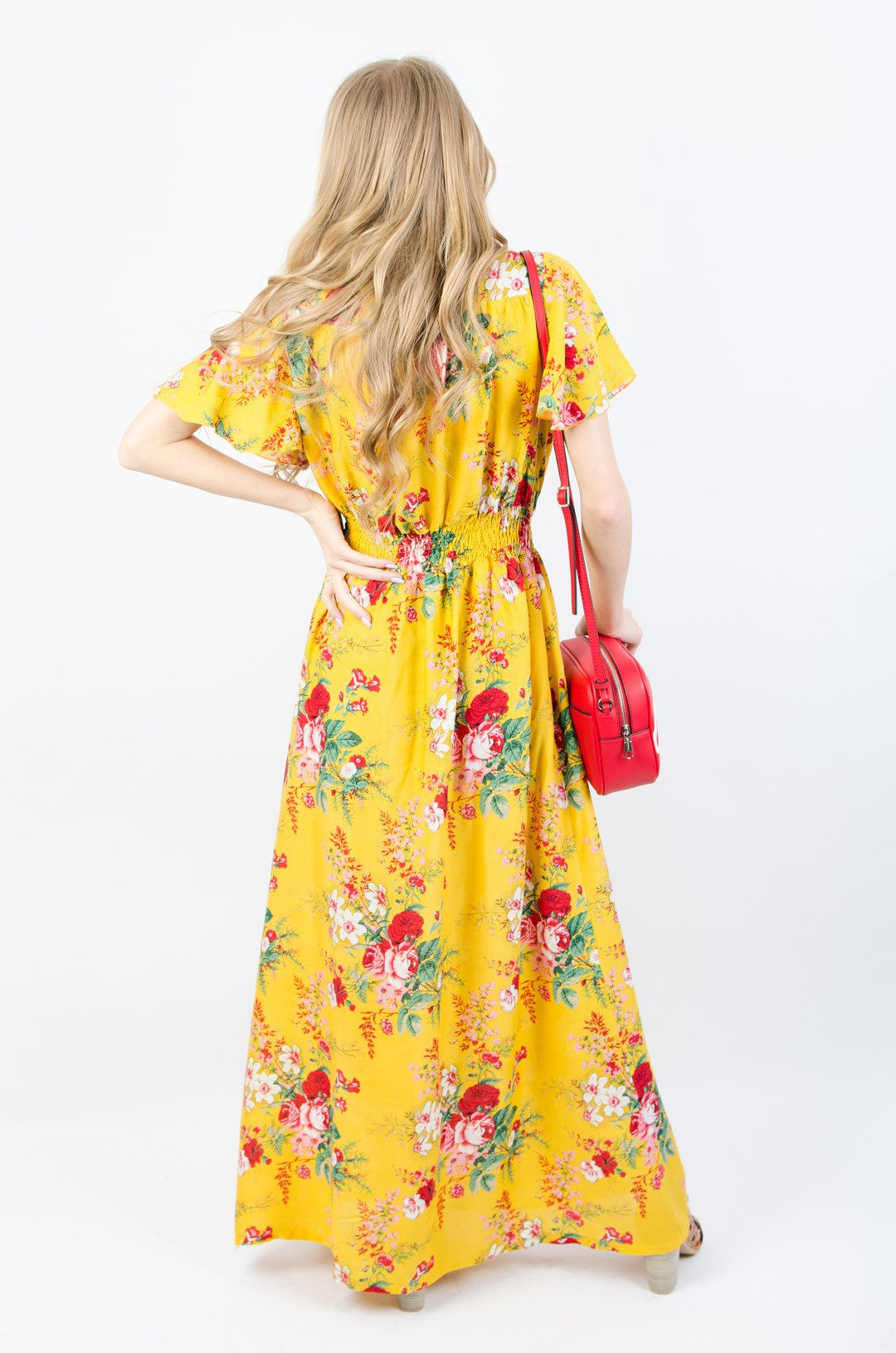 Żółta długa sukienka w kwiaty z gumą w pasie