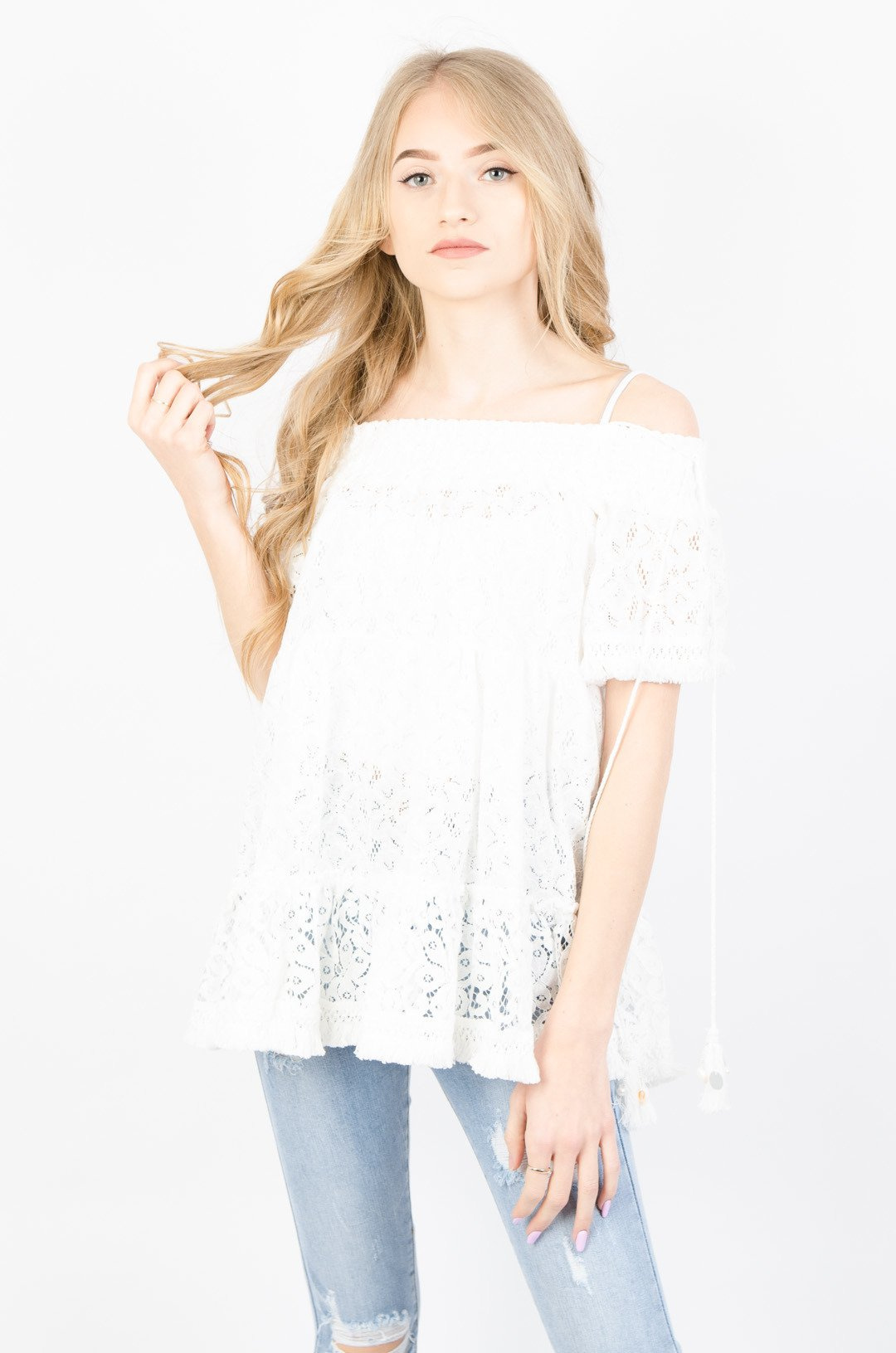 Biała koronkowa bluzka z gumą w dekolcie oraz ramiączkami ze sznurka
