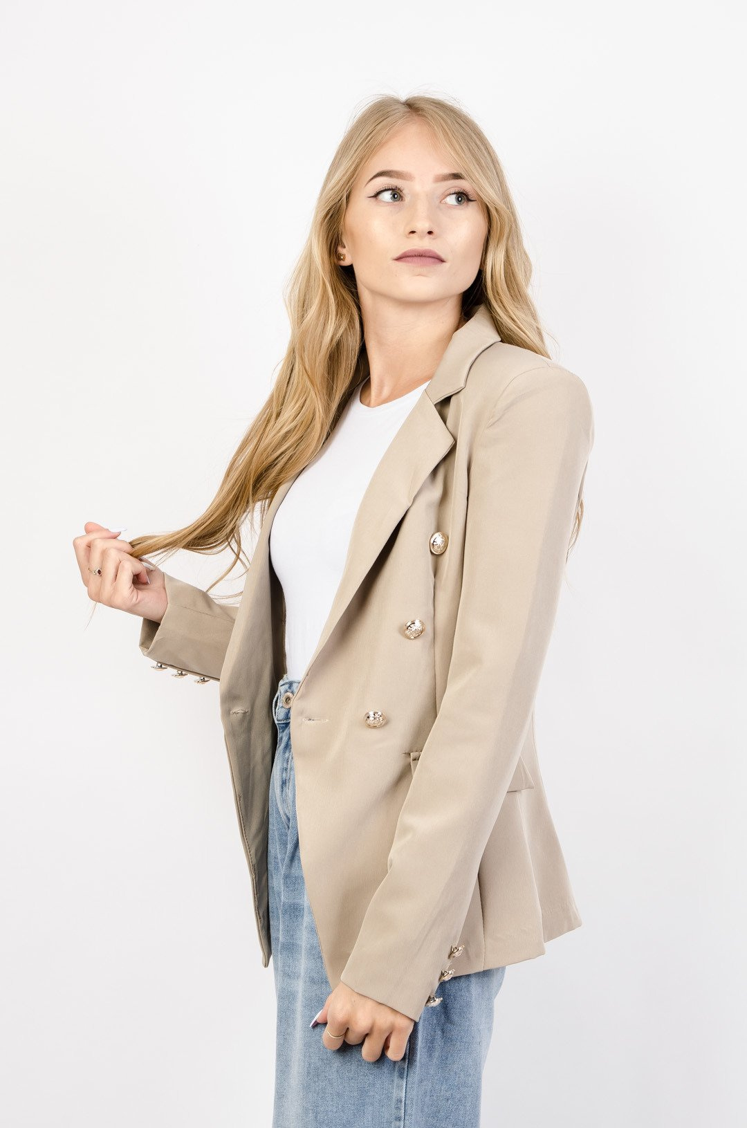 BEŻOWA MARYNARKA ZE ZŁOTYMI GUZIKAMI