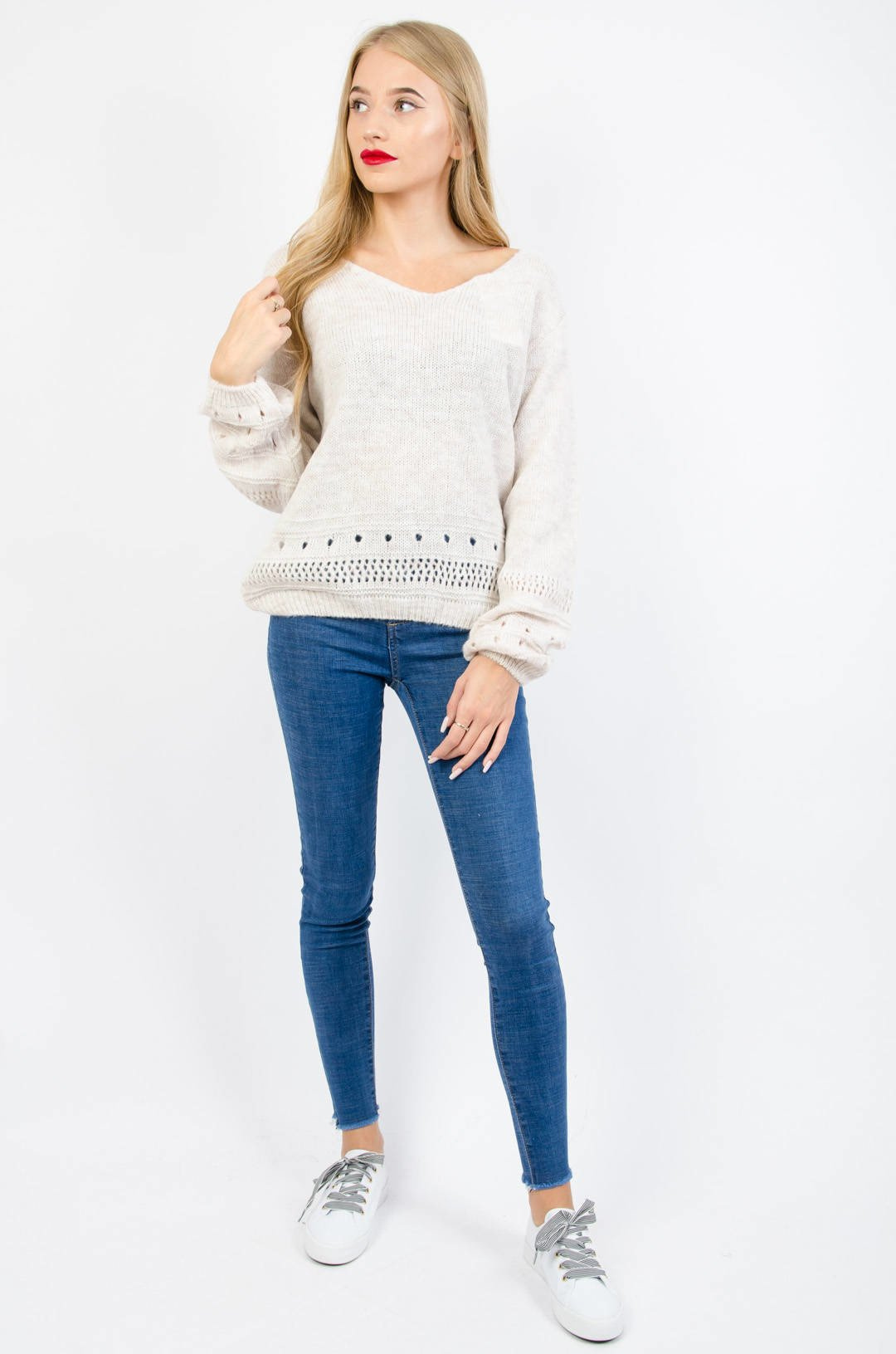 BEŻOWY SWETER Z DEKOLTEM W SZPIC