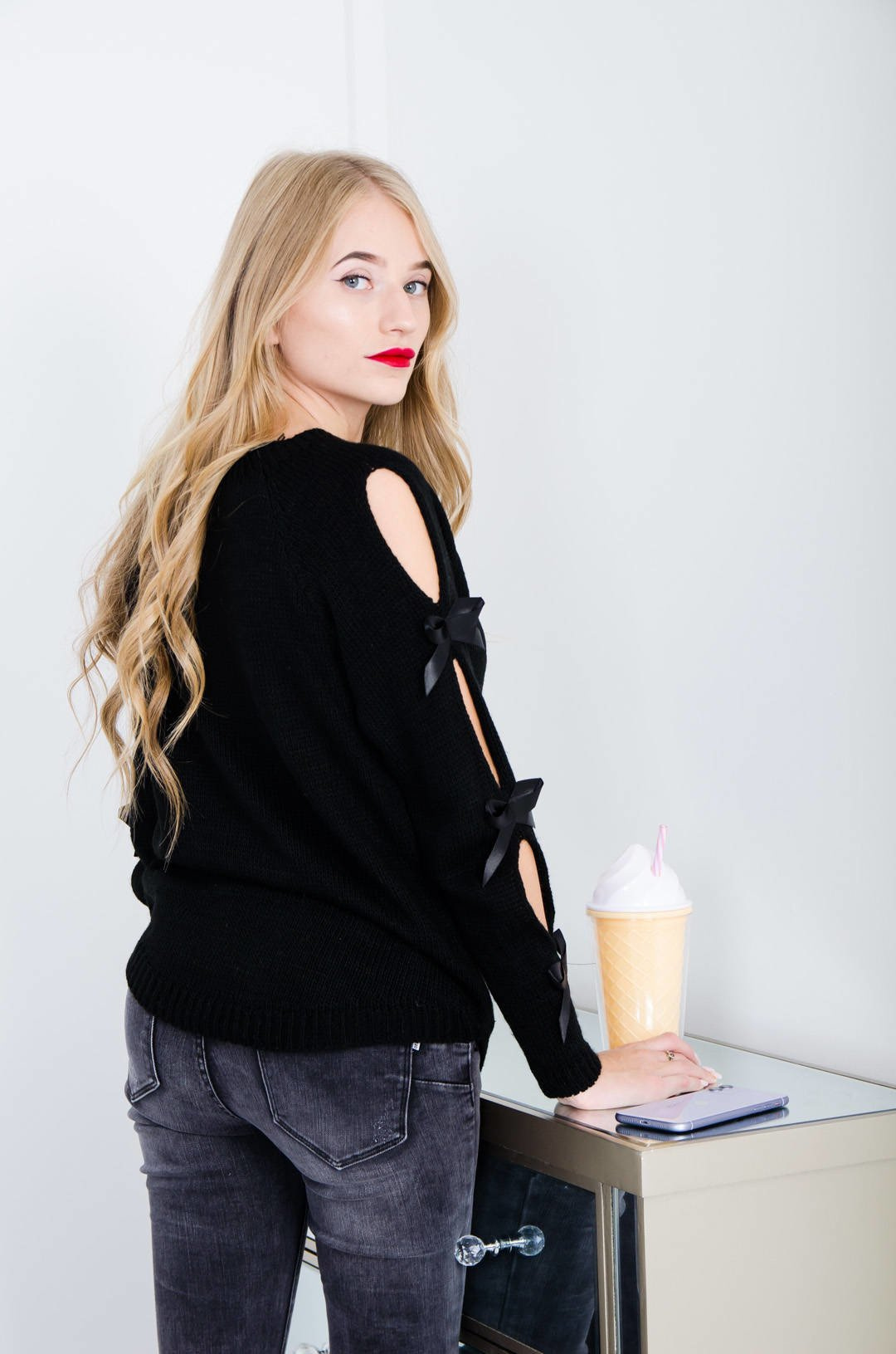 CZARNY AKRYLOWY SWETER Z WSTĄŻKAMI NA RĘKAWACH