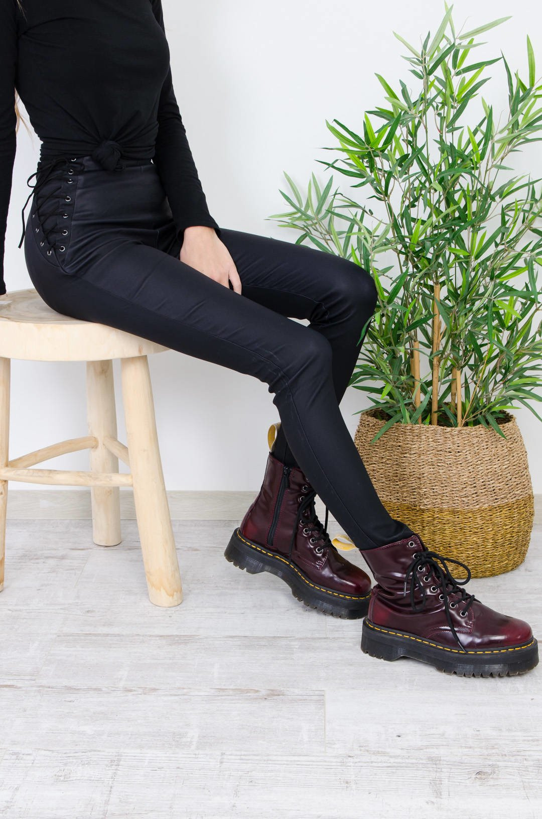 CZARNE WOSKOWANE SPODNIE MODELUJĄCE Z WIĄZANIEM PO BOKACH-MATOWE