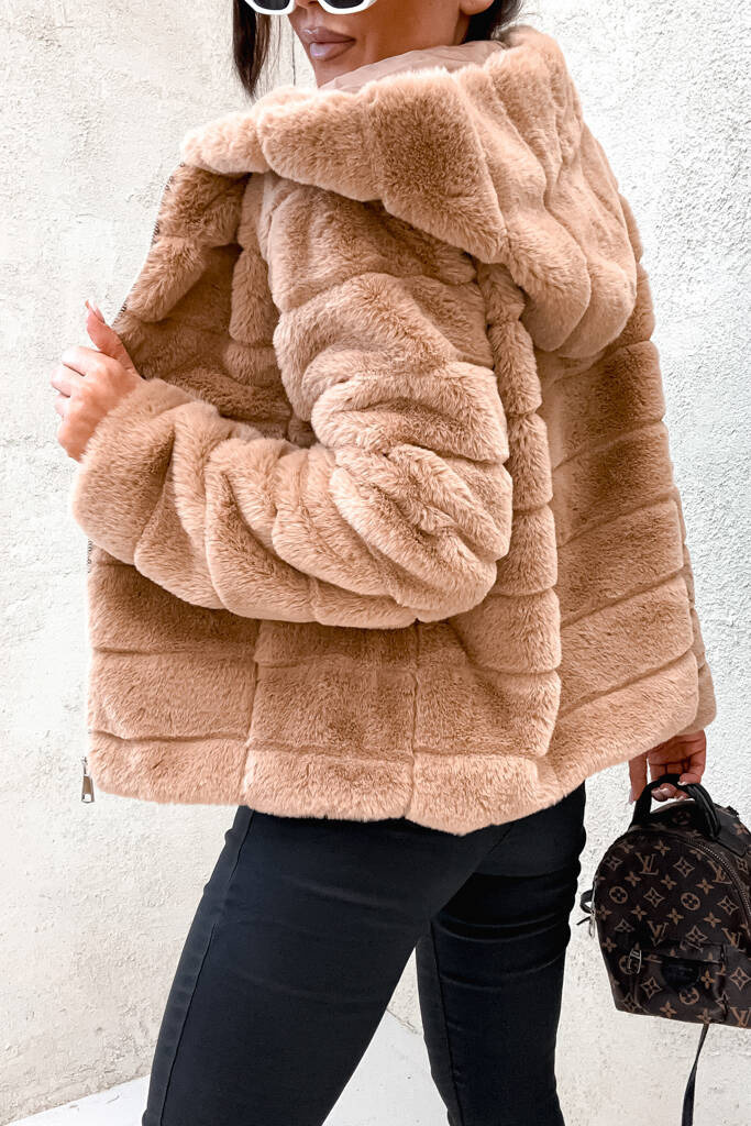 BRĄZOWA FUTRZANA KURTKA Z KAPTUREM
