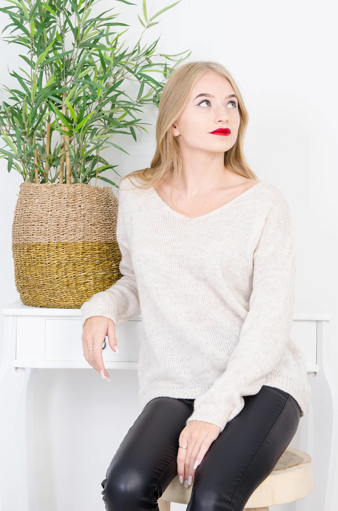 BEŻOWY LUŹNY SWETER Z DEKOLTEM W SZPIC