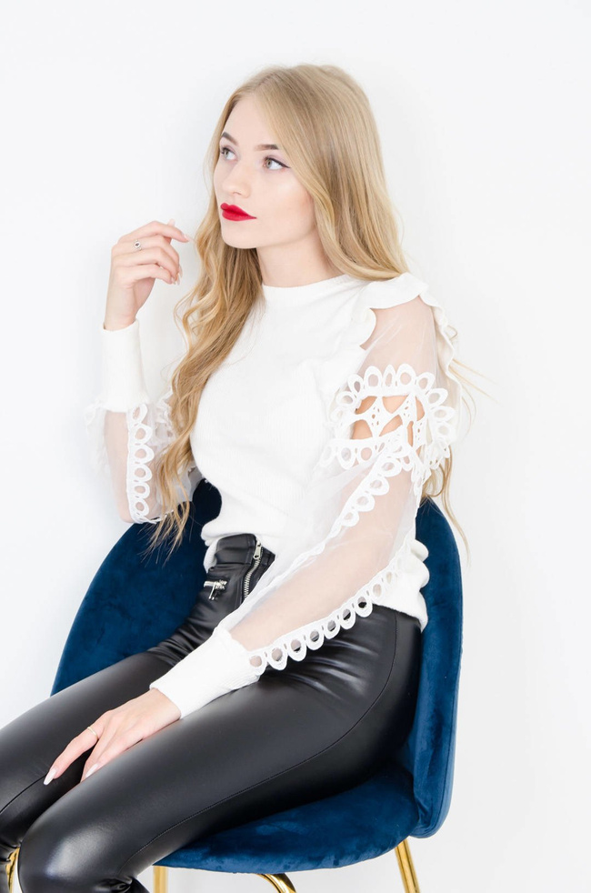 BIAŁA PRĄŻKOWANA BLUZKA Z OZDOBNYMI RĘKAWAMI