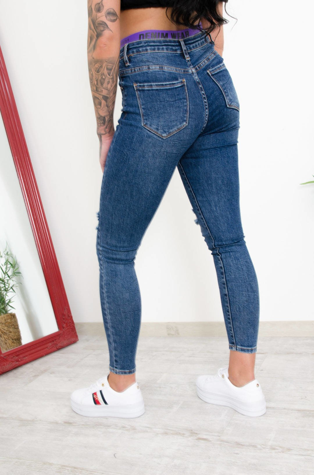 CIEMNE SPODNIE JEANSOWE Z FIOLETOWĄ GUMĄ W PASIE.