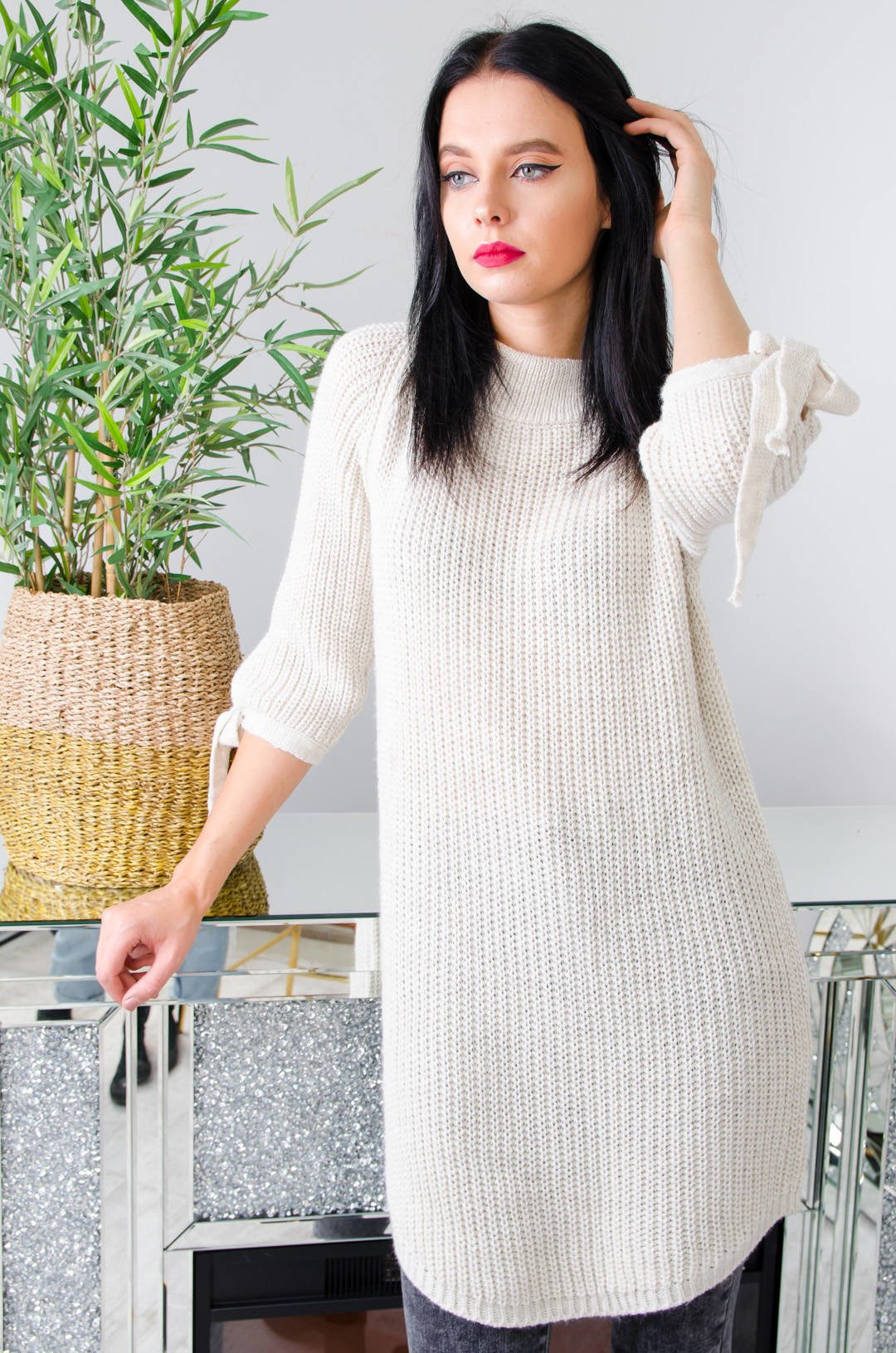 DŁUGI BEŻOWY SWETER-SUKIENKA Z WIĄZANIEM NA RĘKAWACH