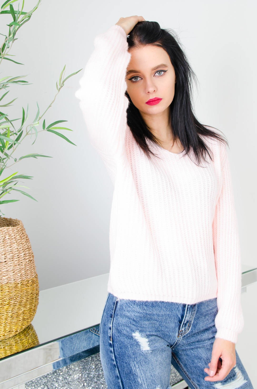 JASNO RÓŻOWY SWETER Z DEKOLTEM W SZPIC