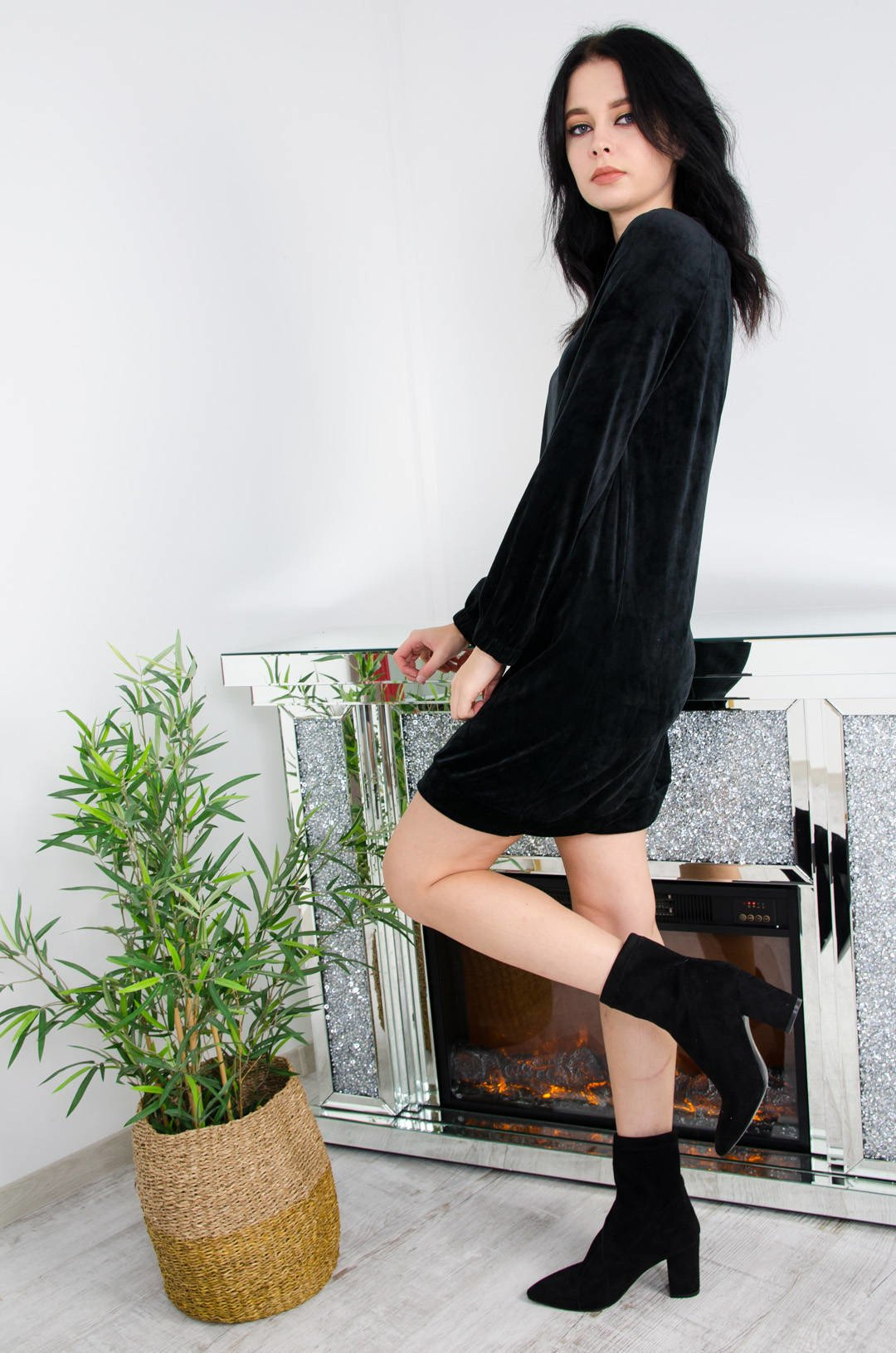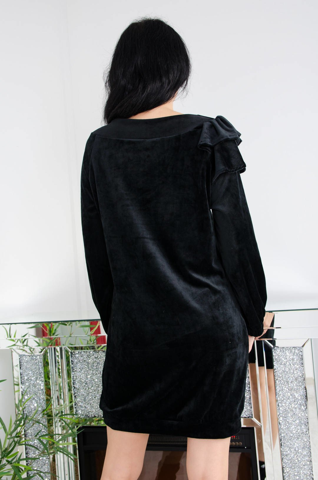 CZARNA WELUROWA SUKIENKA Z FALBANĄ NA RAMIENIU