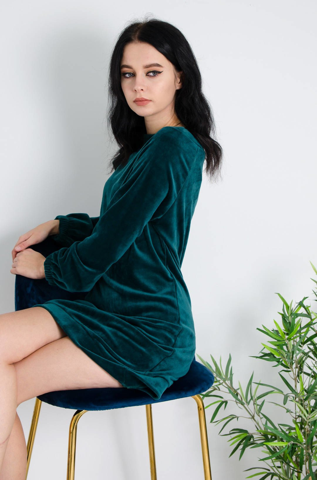 SZMARAGDOWA WELUROWA SUKIENKA Z FALBANĄ NA RAMIENIU