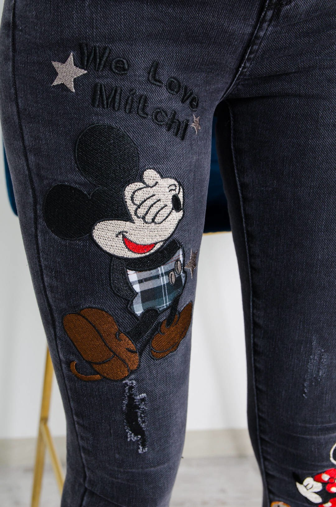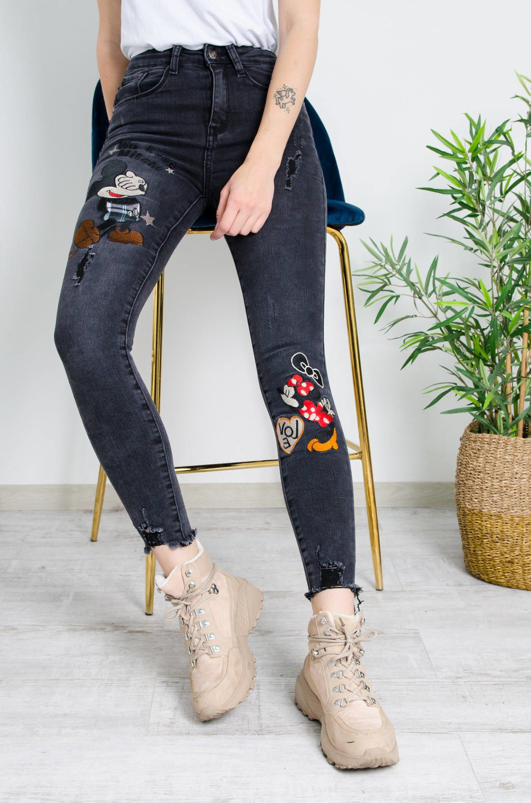CIEMNO-SZARE SPODNIE JEANSOWE Z NASZYWKA MYSZKI - WYSOKI STAN
