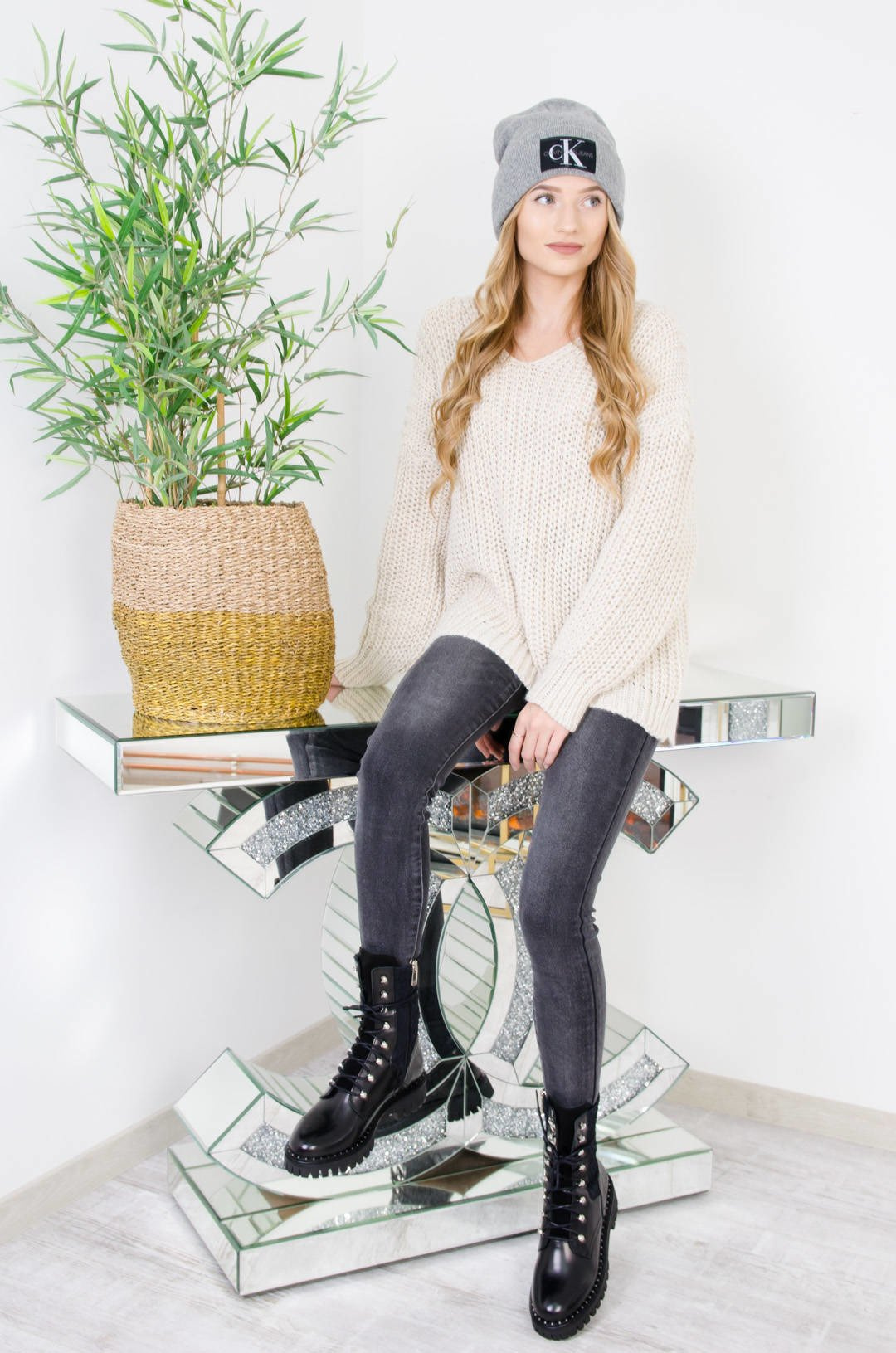 BEŻOWY AKRYLOWY SWETER Z DEKOLTEM W SZPIC