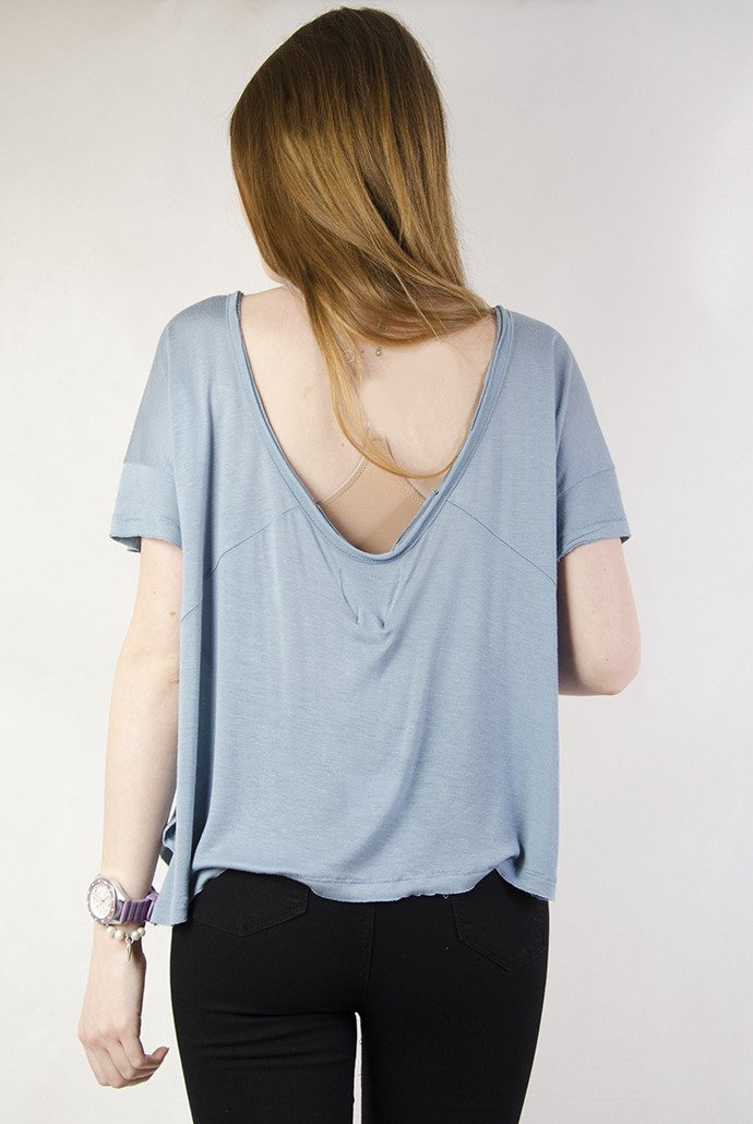 Luźna bluzka, z krótkim rękawkiem. Z przodu nadruk- lampart. Z tyłu na plecach głębokie wycięcie.