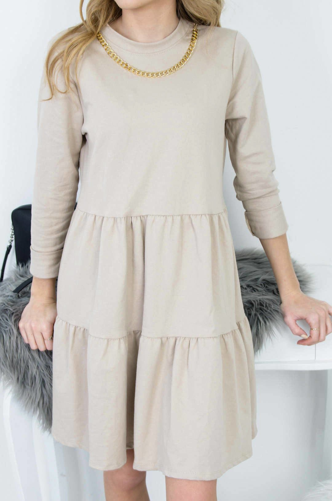 BEŻOWA ROZKLOSZOWANA SUKIENKA ZE ZŁOTYM ŁAŃCUSZKIEM