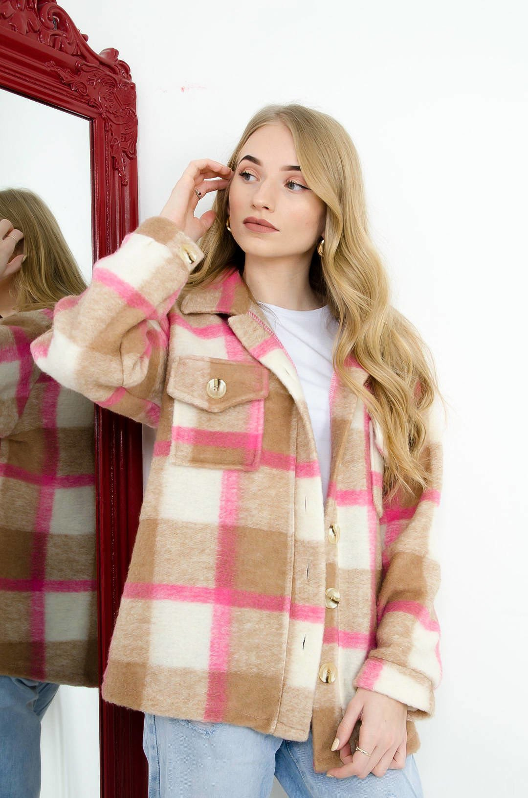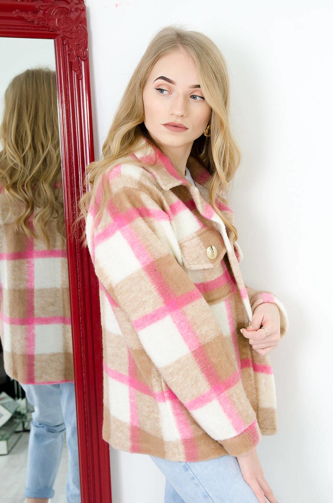 RÓŻOWY PŁASZCZ KOSZULA W KRATĘ