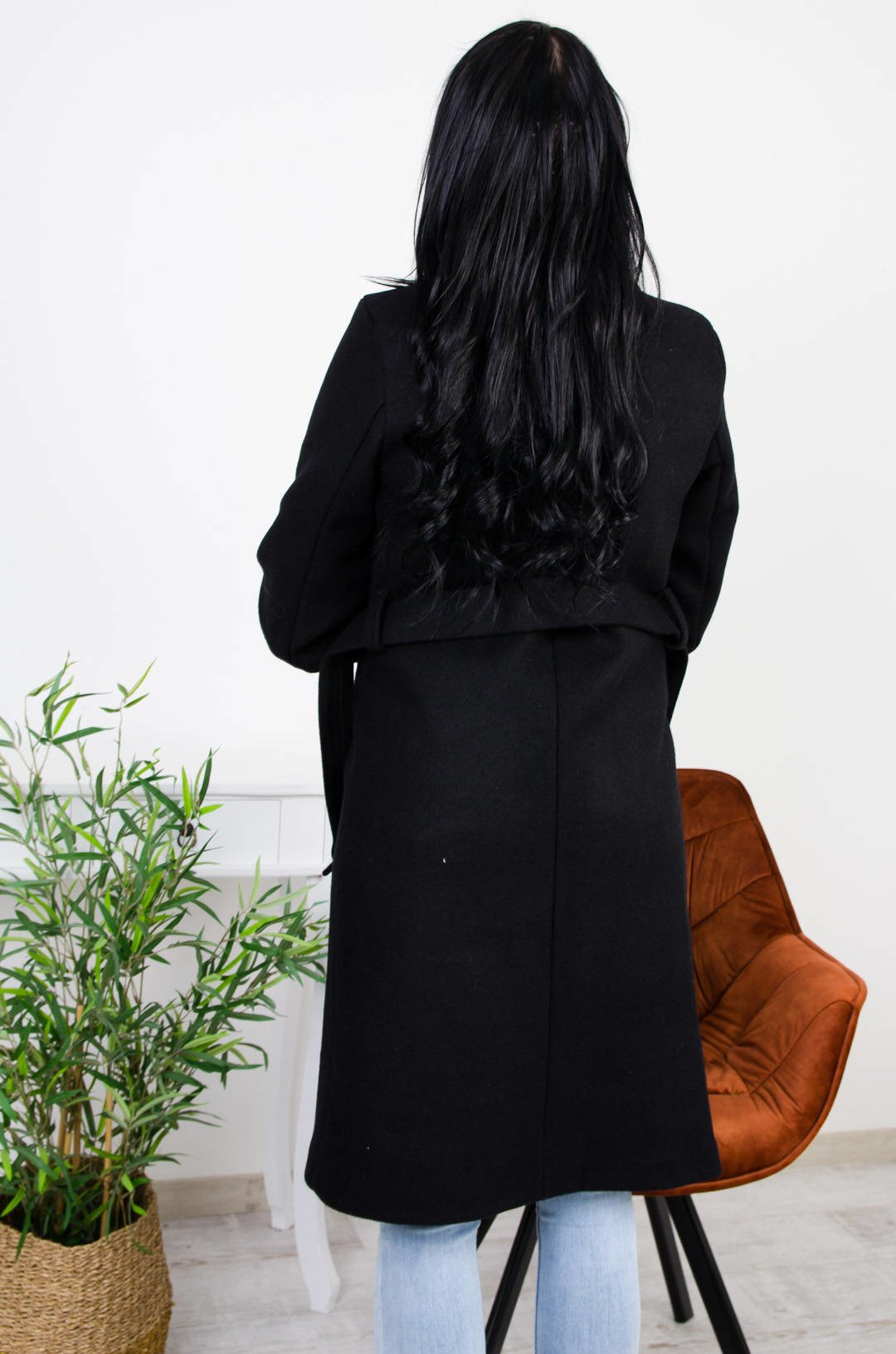 DŁUGI CZARNY TALIOWANY PŁASZCZ