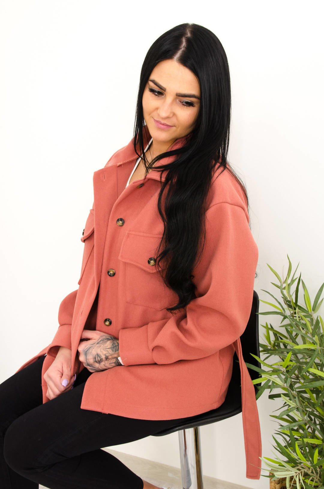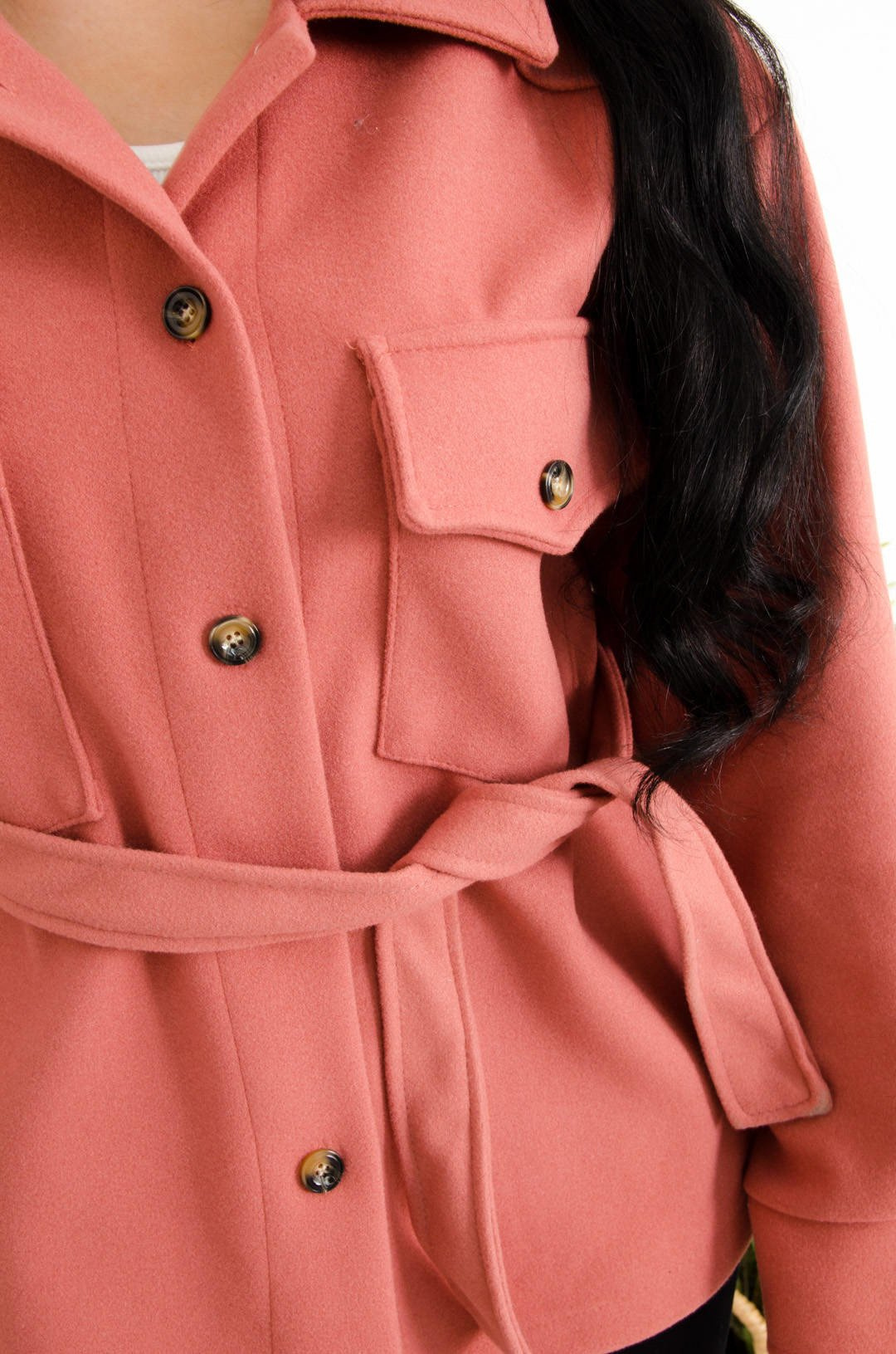 RÓŻOWY KRÓTKI PŁASZCZ WIĄZANY W PASIE