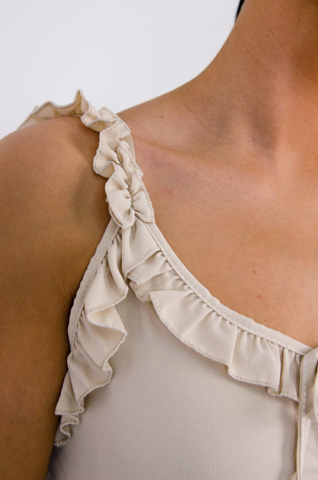 BEŻOWA LUŹNA SUKIENKA Z FALBANKĄ NA RAMIĄCZKACH