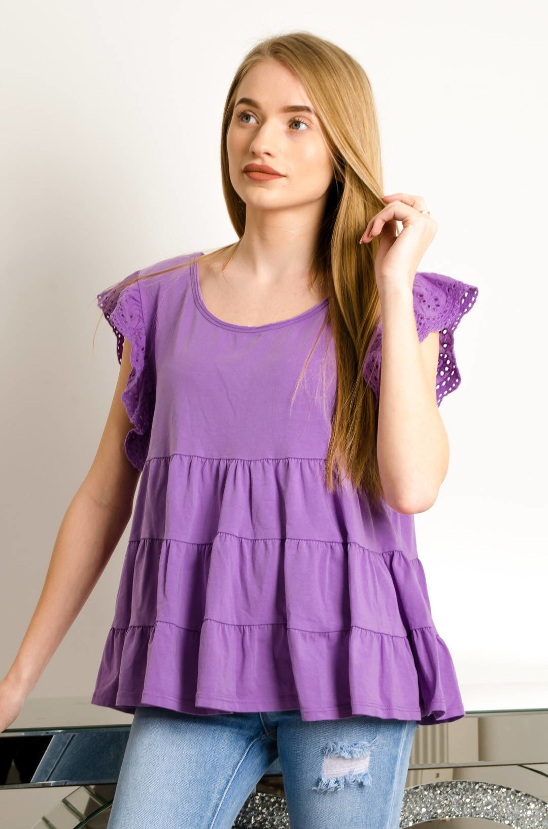FIOLETOWA ROZKLOSZOWANA BLUZKA Z AŻUROWYMI RĘKAWAMI