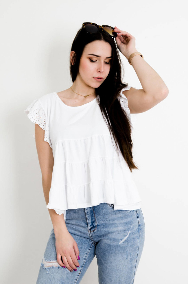 BIAŁA ROZKLOSZOWANA BLUZKA Z AŻUROWYMI RĘKAWAMI